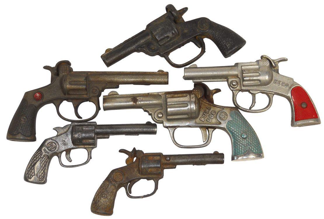 Toy cap guns (6), all cast iron, Sliko, Hero w/red grips, Bull Dog, Oh Boy & 2 marked SW (one missing spring), all c.1920's in VG cond, largest is 6.5"L.