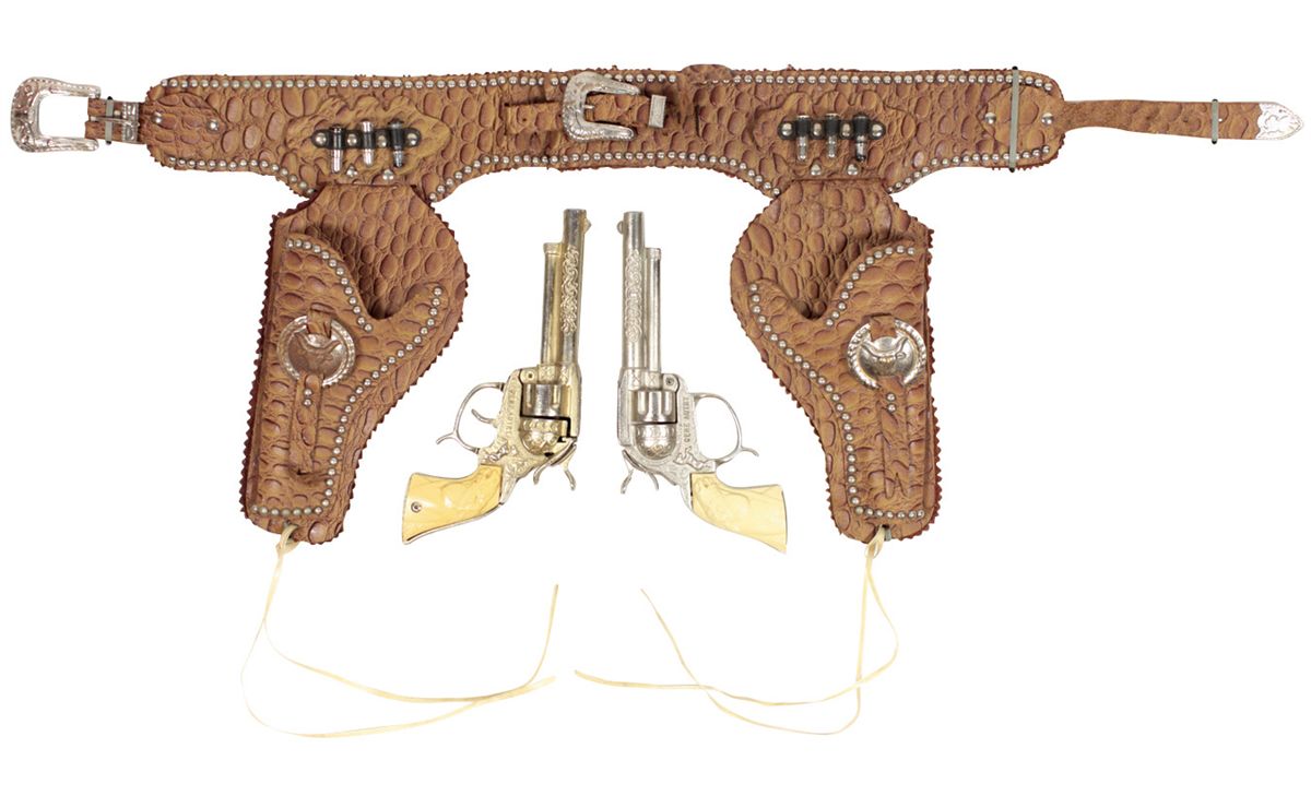 Toy cap guns & holsters, Gene Autry set w/Leslie Henry pistols, guns have revolving barrels, side loaders & fancy belt/holsters w/toy bullets, Exc cond.