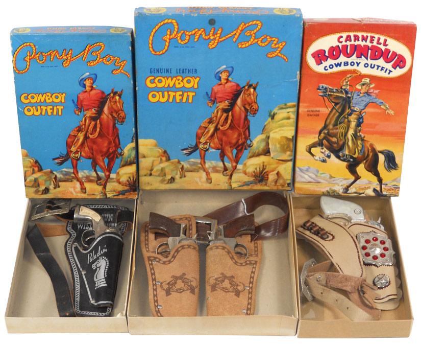 Toy cap guns & holsters in boxes, Mustang 50-shot repeater by Kilgore, Exc orig cond on header card, Real Texan Holster in box w/Halco Young Buffalo Bill cap gun, Carnell Round-Up Cowboy Outfit w/Cowboy King cap gun, Pony Boy double holster set w/pr of Hubley cap guns & Pony Boy box w/Paladin holster & Buzz Henry Lone Rider cap gun by B&H, Good to Exc cond.