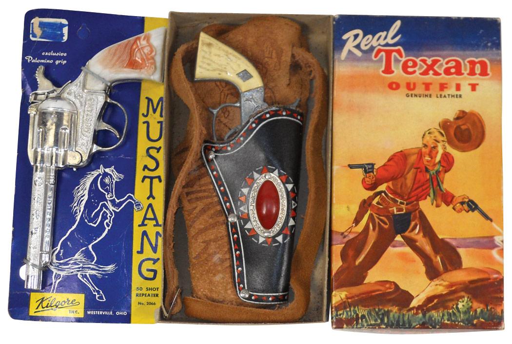 Toy cap guns & holsters in boxes, Mustang 50-shot repeater by Kilgore, Exc orig cond on header card,