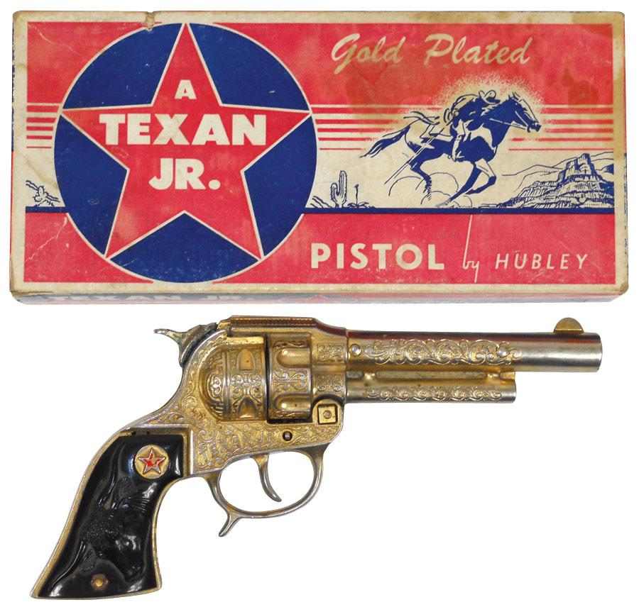 Toy cap guns in boxes (2), J.& E. Stevens Co. Buffalo Bill repeating toy cap pistol, NOS in orig box & Hubley Texan Jr. Gold Plated Pistol, VG cond in orig box.