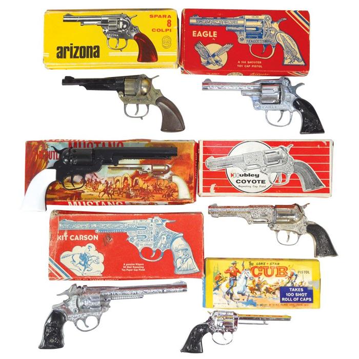 Toy cap guns in boxes (6), includes Hubley Coyote, Kilgore Eagle-black eagle grips, Lone Star Cub, Arizona No. 73-Made in Italy, Outlaw Mustang-Made in England & Kilgore Kit Carson No. 150, all guns Exc cond, boxes Good to Exc cond.