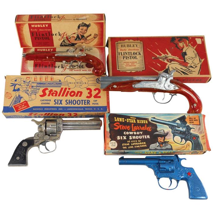 Toy cap guns in orig boxes w/1 empty box, Hubley Flintlock cap pistol, Model 222-59, Stallion 32 Six Shooter #32, Lone Star Rider Steve Larrabee Cowboy 2-Shooter No. 152, Hubley Early Am Flintlock Pistol double barrel 2-shot cap shooting No 280, empty box for Hubley Jr. Flintlock pistol-222-59, all VG cond.