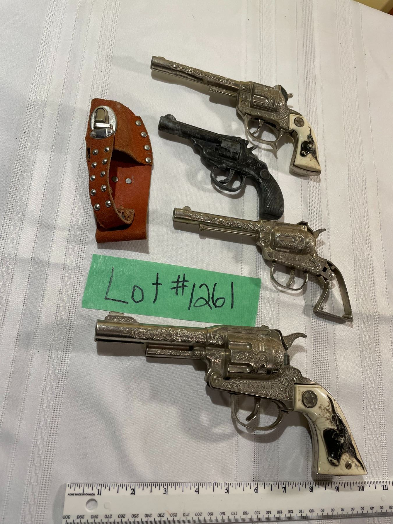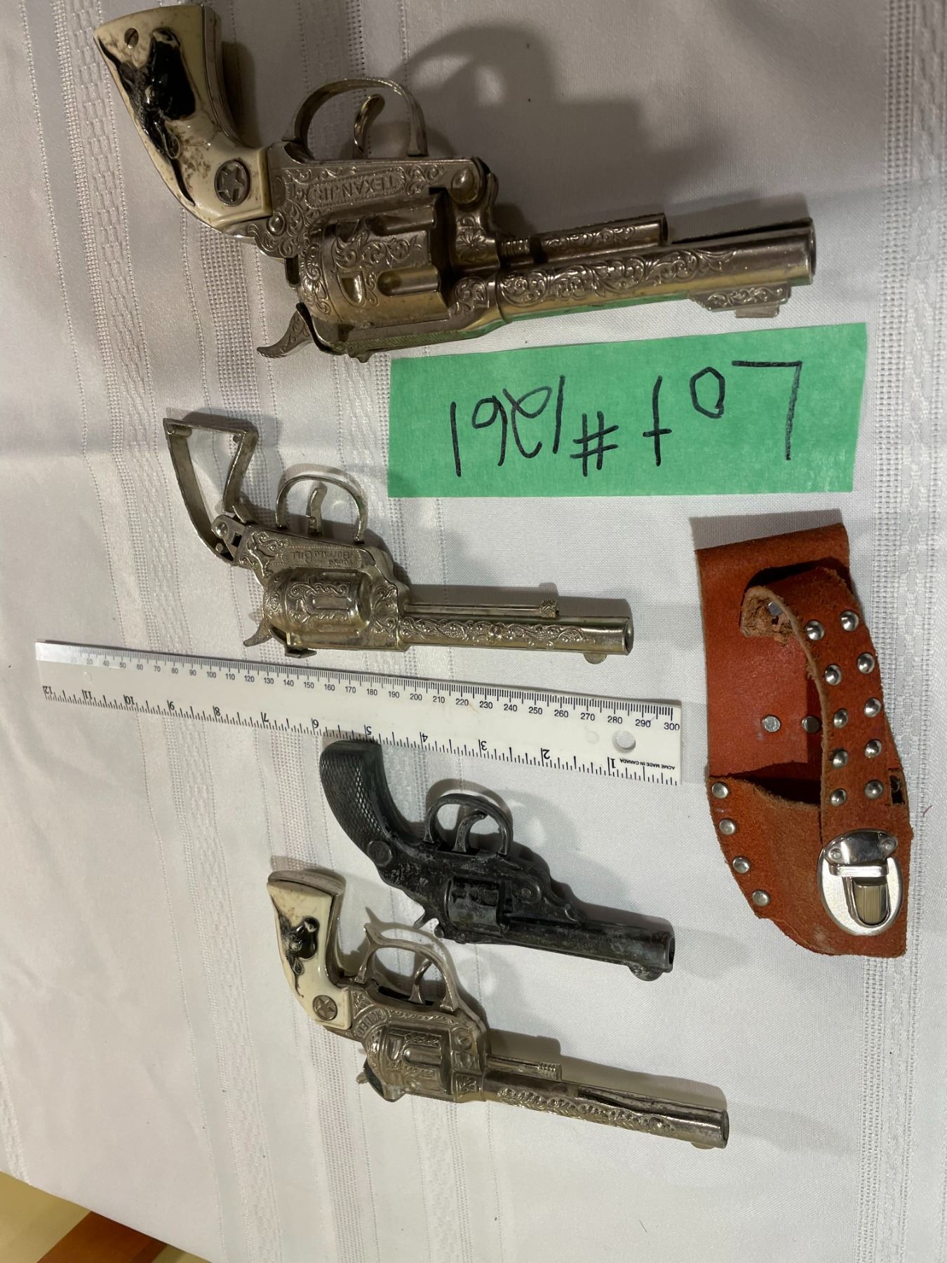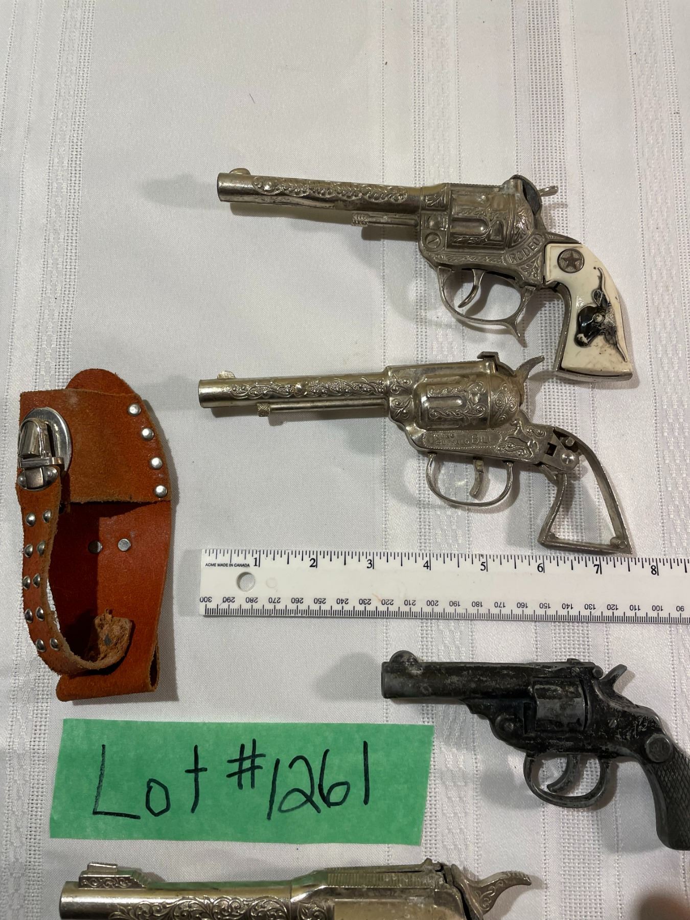 (1) Buffalo Bill- No insert in stock handle (1) Dark Metal Cap gun- small (1) Larger Texan Jr. Cap gun (1) Rodeo Toy Gun (1) Leather Toy gun Holster