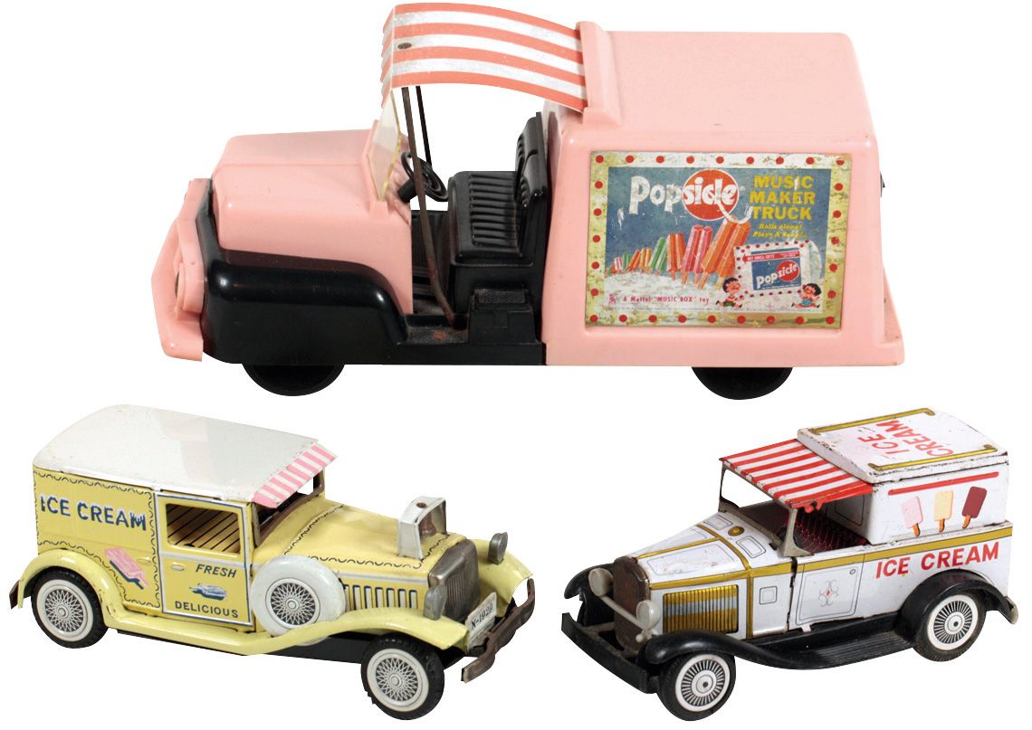 Toy ice cream vendor trucks (3), Rare Bandai tin friction ice cream sedan, c.1929, Exc/NM cond, 7.25"L; tin & plastic Mattel "Popsicle" musical truck, VG cond w/no music, 11"L & Bandai tin friction ice cream sedan w/striped awning, VG cond, 6.5"L.