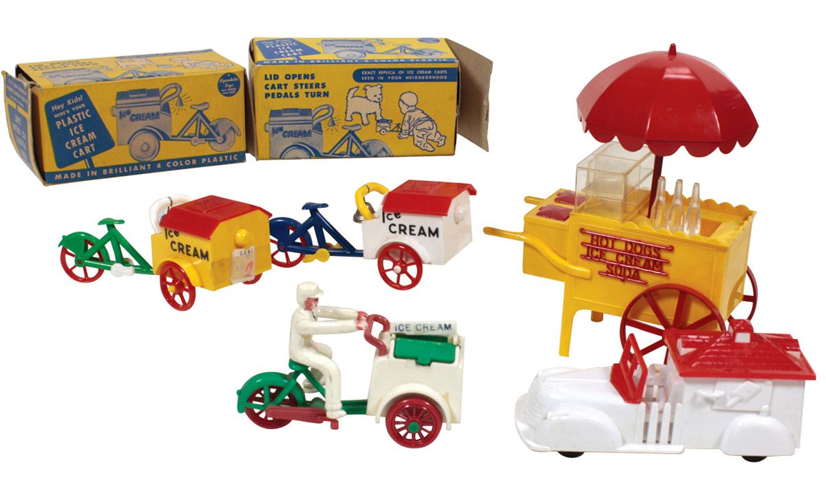 Toy ice cream vendors (5), (2) Wyandotte ice cream bicycles, both w/orig boxes missing a tab, one an unusual color, ea 4.5"L, Canadian Reliable ice cream bicycle vendor, broken tab on Ice Cream sign, 4.5"L, probably a Rennal ice cream truck, 5.5"L & Ideal Hot Dog/Ice Cream umbrella cart, 7.5"H x 6"L, all are plastic in Exc cond unless noted.