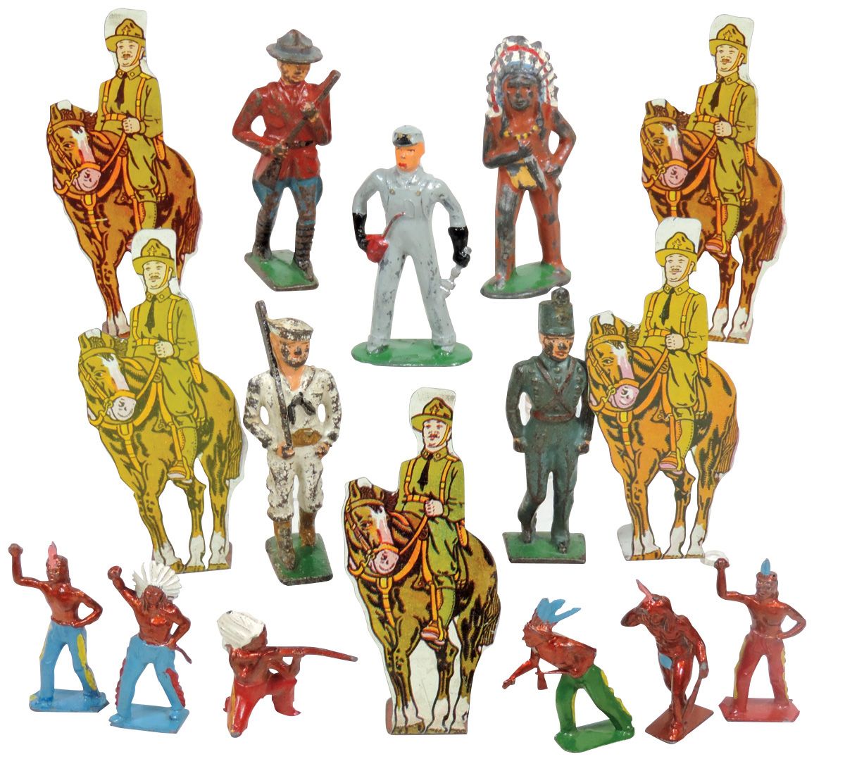 Toy lead figures (16), 11 assorted military, Native American & other figures & set of 5 U. S. Cavalry soldiers on horseback tin cut-outs (figures are the same w/variations in color), Good/VG cond, 4.5"H.