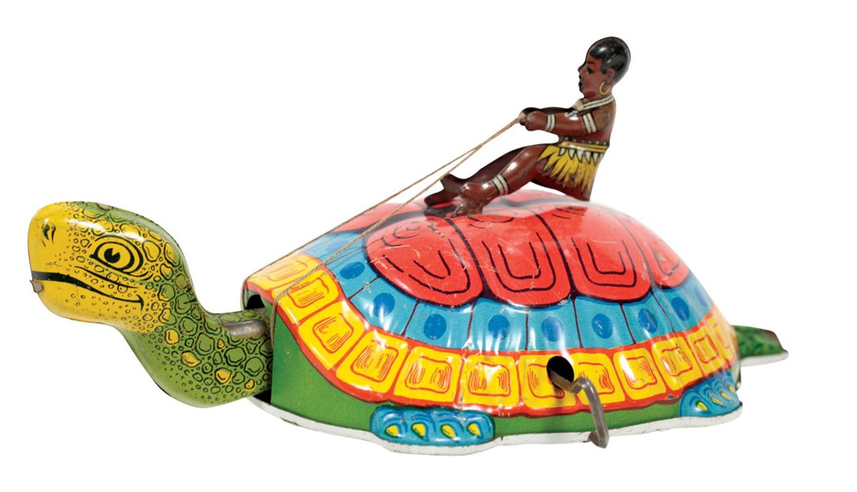 Toy, native riding turtle, tin litho windup, bright paint w/few scratches & sm dent on rider's head, Exc wkg cond, 7.5"L.