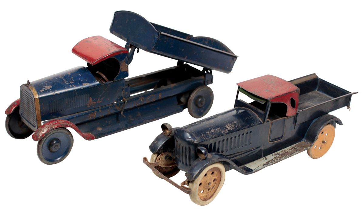 Toy trucks (2), Scheible delivery truck, missing rubber on one tire, VG cond w/orig paint on body, 19"L & most likely a Turner dump truck w/lift mech, VG orig cond, 20"L.