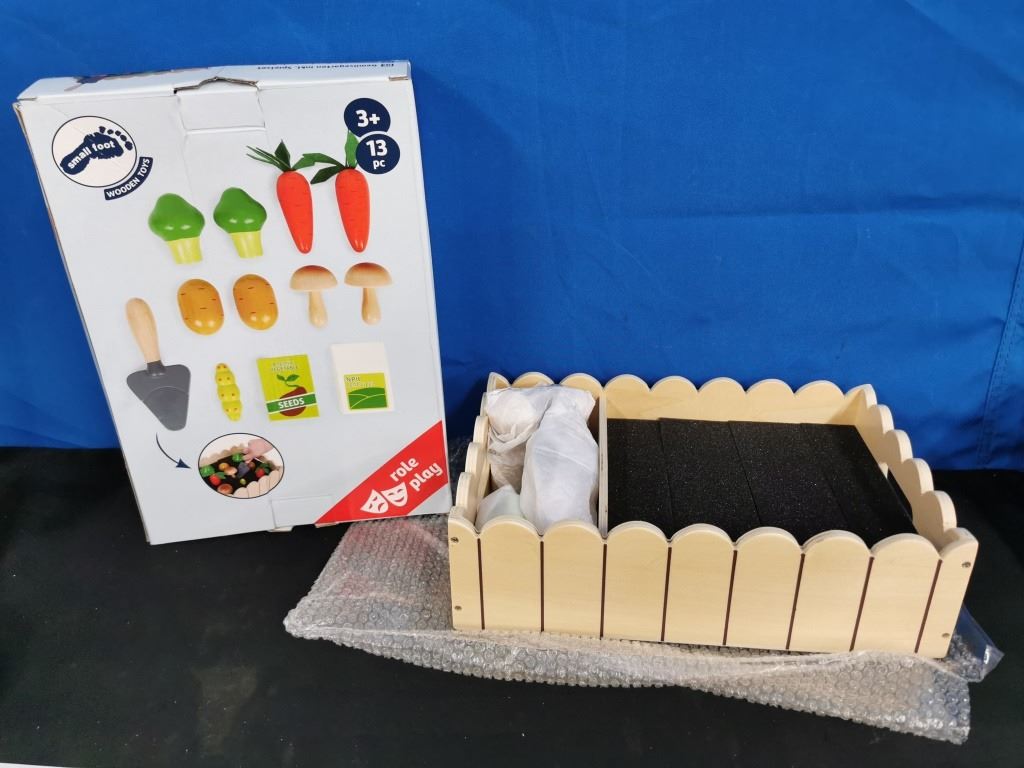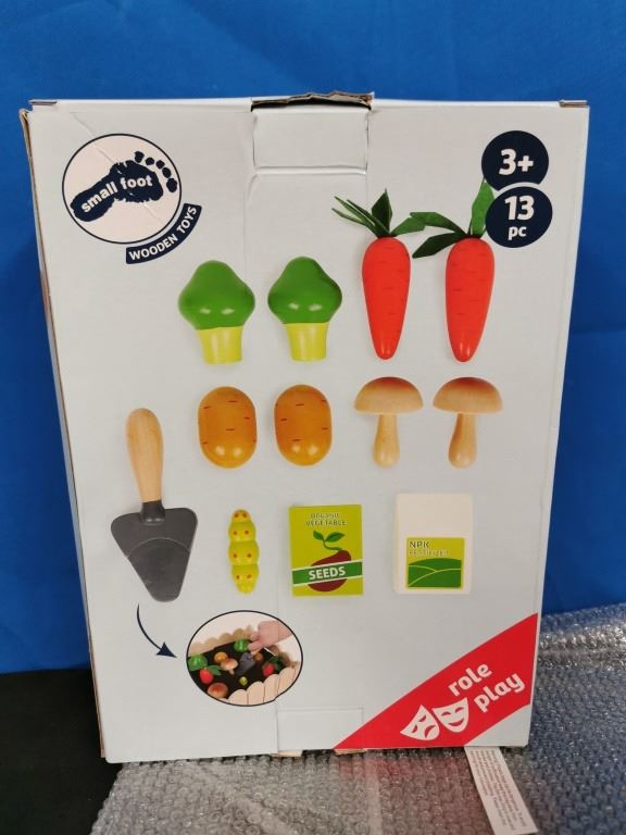 New in box, Toy Vegetable Garden Play Set 13pcs. Includes wooden vegetable garden box that measures 12.5 in by 8.5 in and vegetables including carrots, potatoes, mushroom and more. Foam inserts make up play