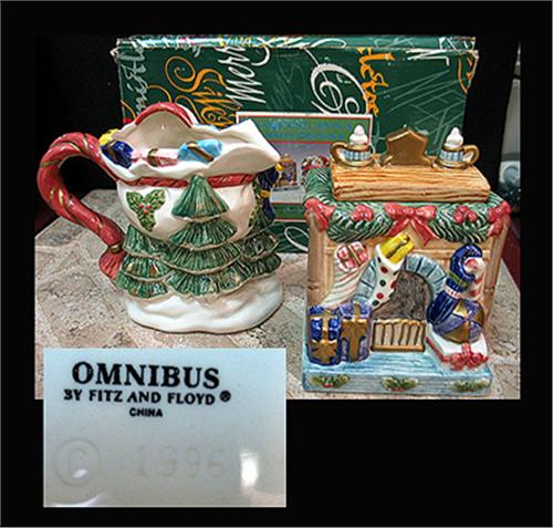 Toyland Santa Sugar and Creamer by Fitz and Floyd. In original box no cracks or crazing. One touchup with gold paint to a bow