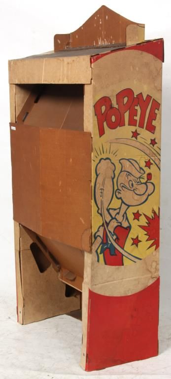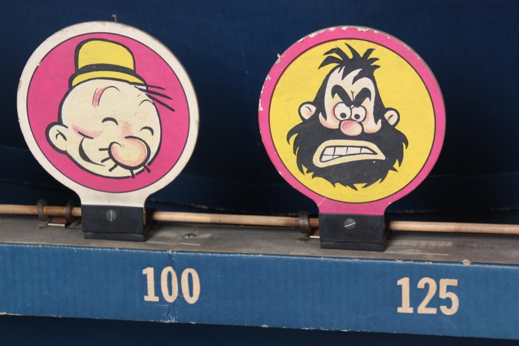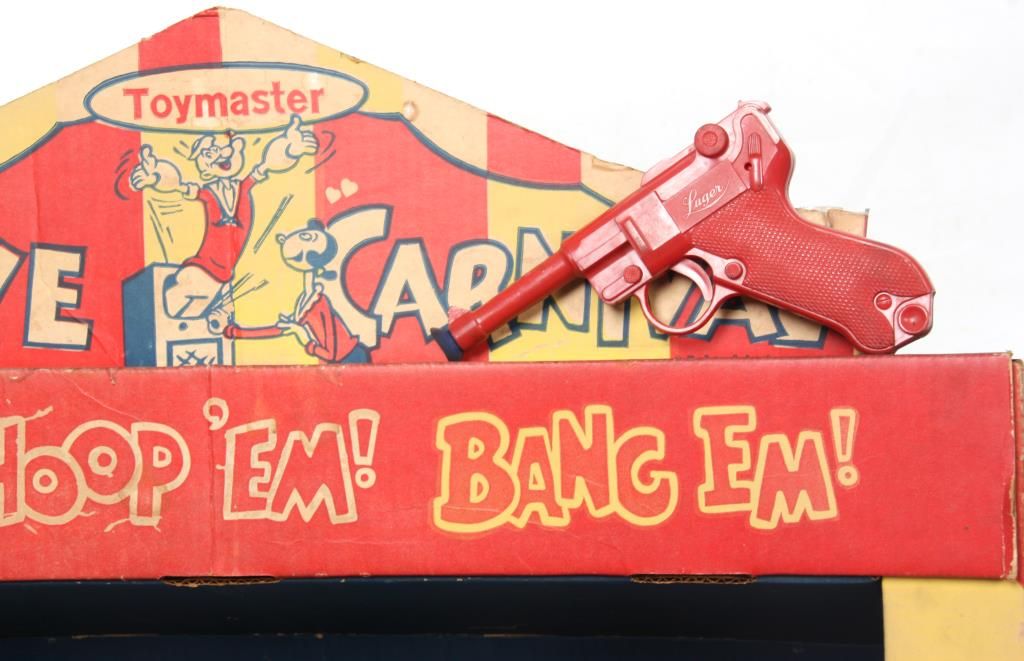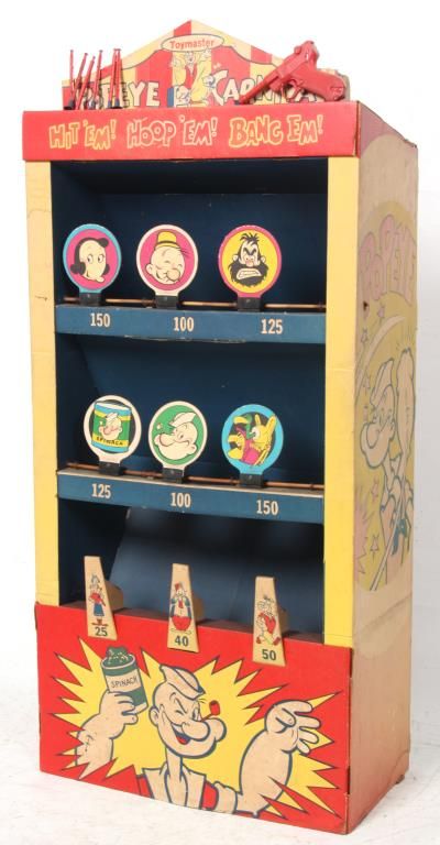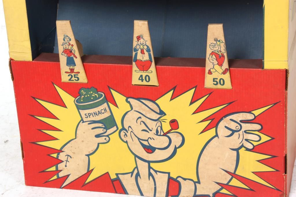 Toymaster Popeye Carnival Booth Game. Large cardboard “Hit’em! Hoop’em! Bang’em” booth type carnival shooting game with character targets and celluloid plastic Luger toy gun shooting plastic darts with rubber suction tips. Gun does not fire and the booth has some staining but is in excellent condition for its age. 57.5 in. high x 25.5 in. wide x 13.5 in. deep.