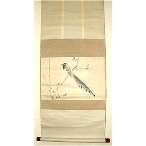 This Japanese symbol of resilience and perseverance, the Japanese apricot or plum tree, is wonderfully rendered here by Toyo. The upward diagonal of the bird is is stabilized by the opposing compositional movement of the tail, contrasting with the simplicity of the young, yearning blossoms, with all elements brought forward by a wise use of space. Really a wonderful painting, technically and compositionally. Mount: 43 x 17.5 inches, 109 x 44 cm. Painting: 11 x 17 inches, 28 x 43 cm