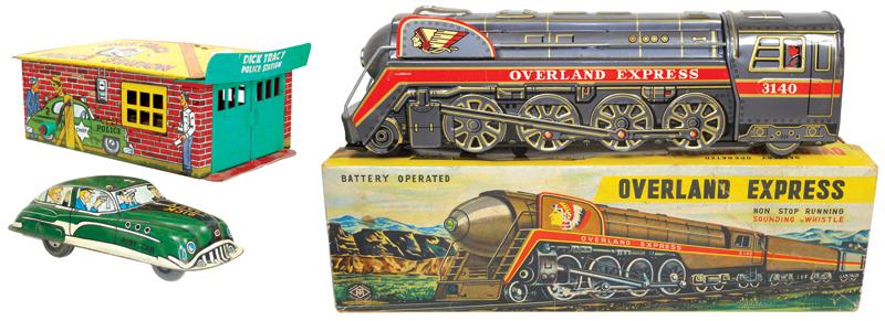 Toys (2), Dick Tracy Police Station w/Dick Tracy Police Riot Car by Marx, appears complete but car doesn't eject from station, 4"H x 9"L & Modern Toys Overland Express #3140, battery-operated, Exc cond w/orig box, 4.5"H x 15"L.