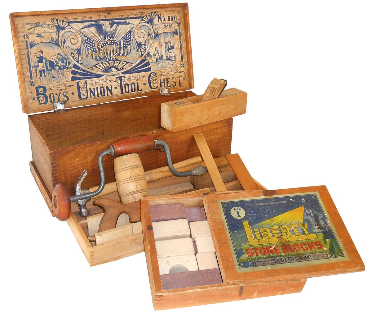 Toys (2), Liberty Stone Blocks in orig wood box w/paper litho label showing Statue of Liberty, mfgd by Phoenix Toy Co. & Boys Union Tool Chest w/hammer, saw & other tools, VG cond, 5.5"H x 14"W x 7"D.
