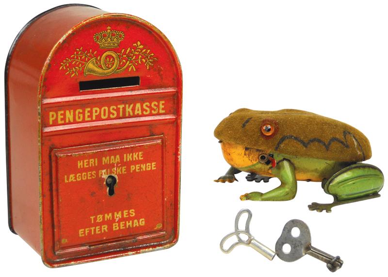 Toys (2), jumping frog, mfgd by Gunthermann-Germany, frog leans forward & does flips, cloth over tin w/glass eyes, VG working cond w/key, 4"L & Pengepostkasse, litho on tin German post office box, VG cond, 5"H x 3"W.