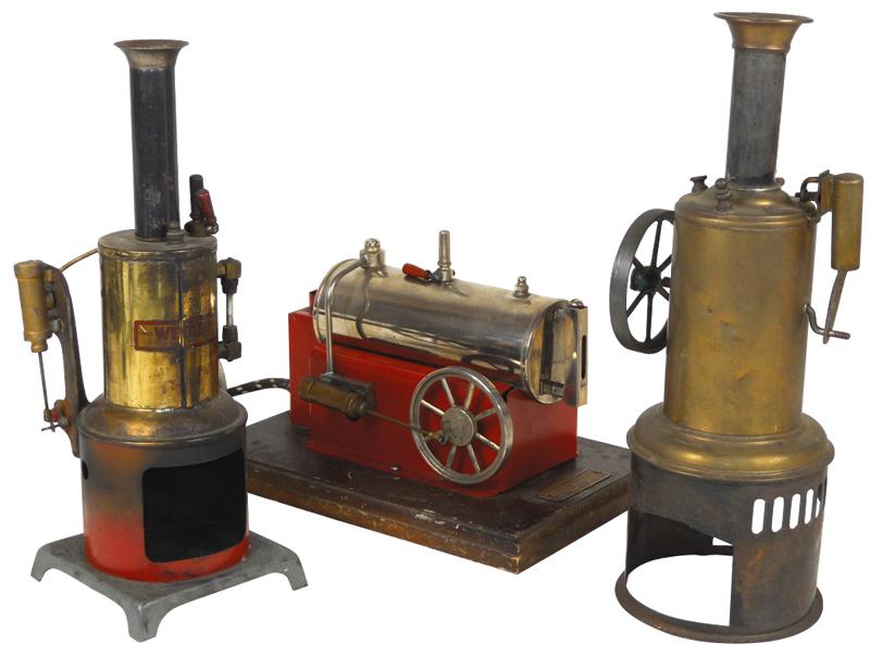 Toys (3), steam powered boilers, 2 mfgd by Weeden, one unmarked, all stamped metal, electric one is Exc, others VG, 6" to 11.5"H.