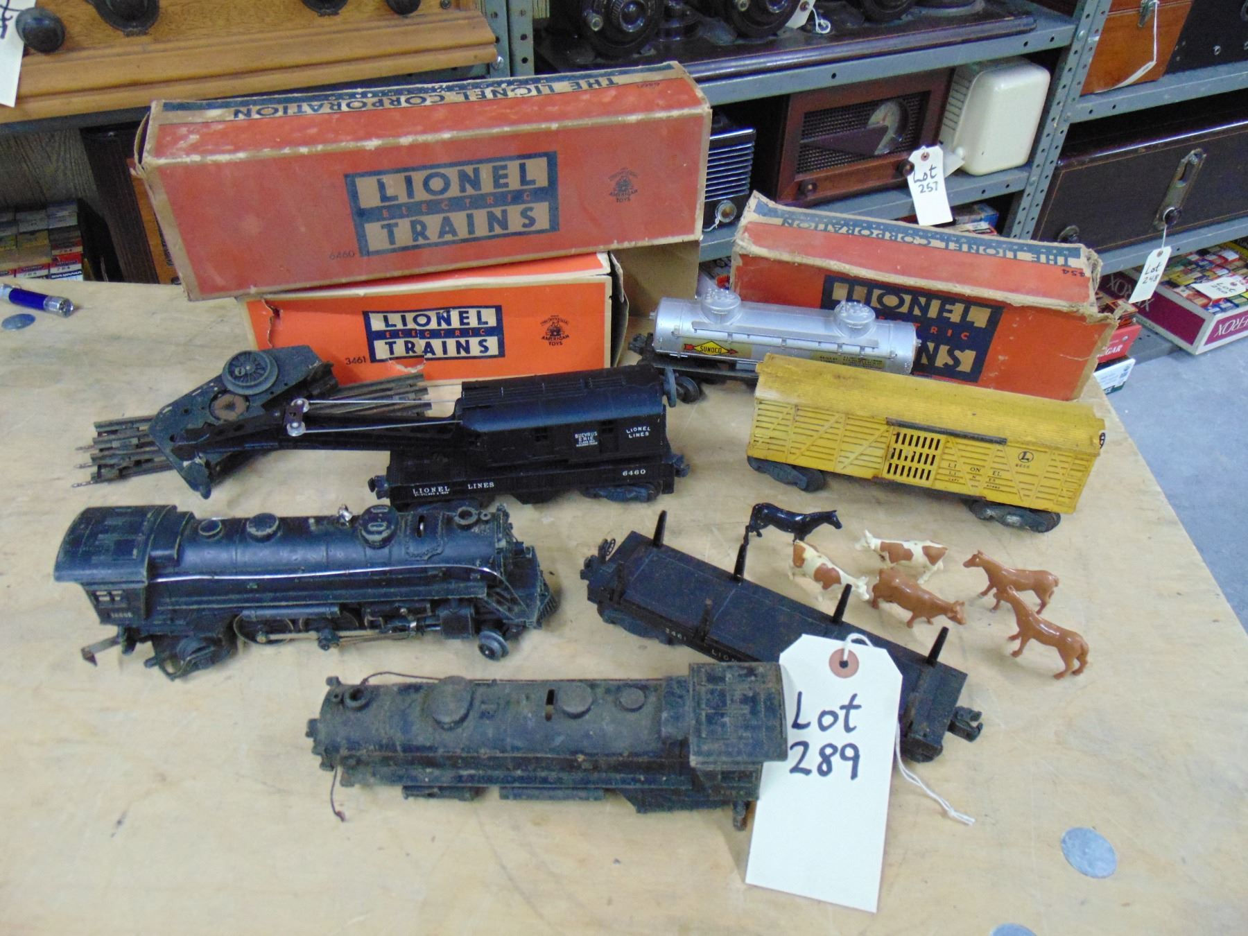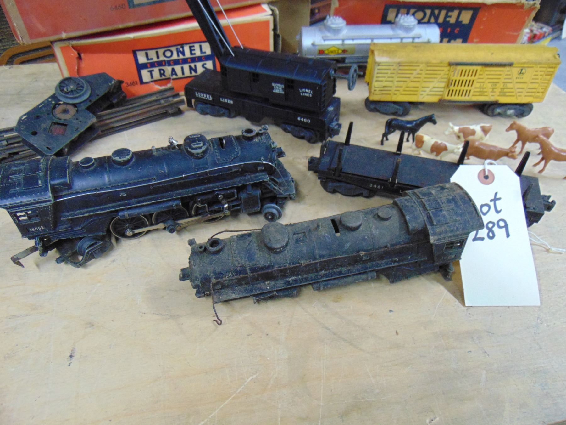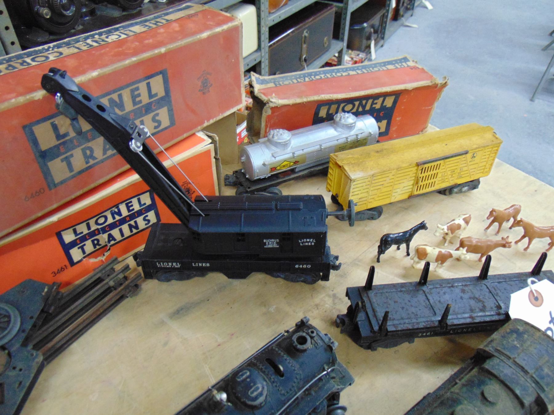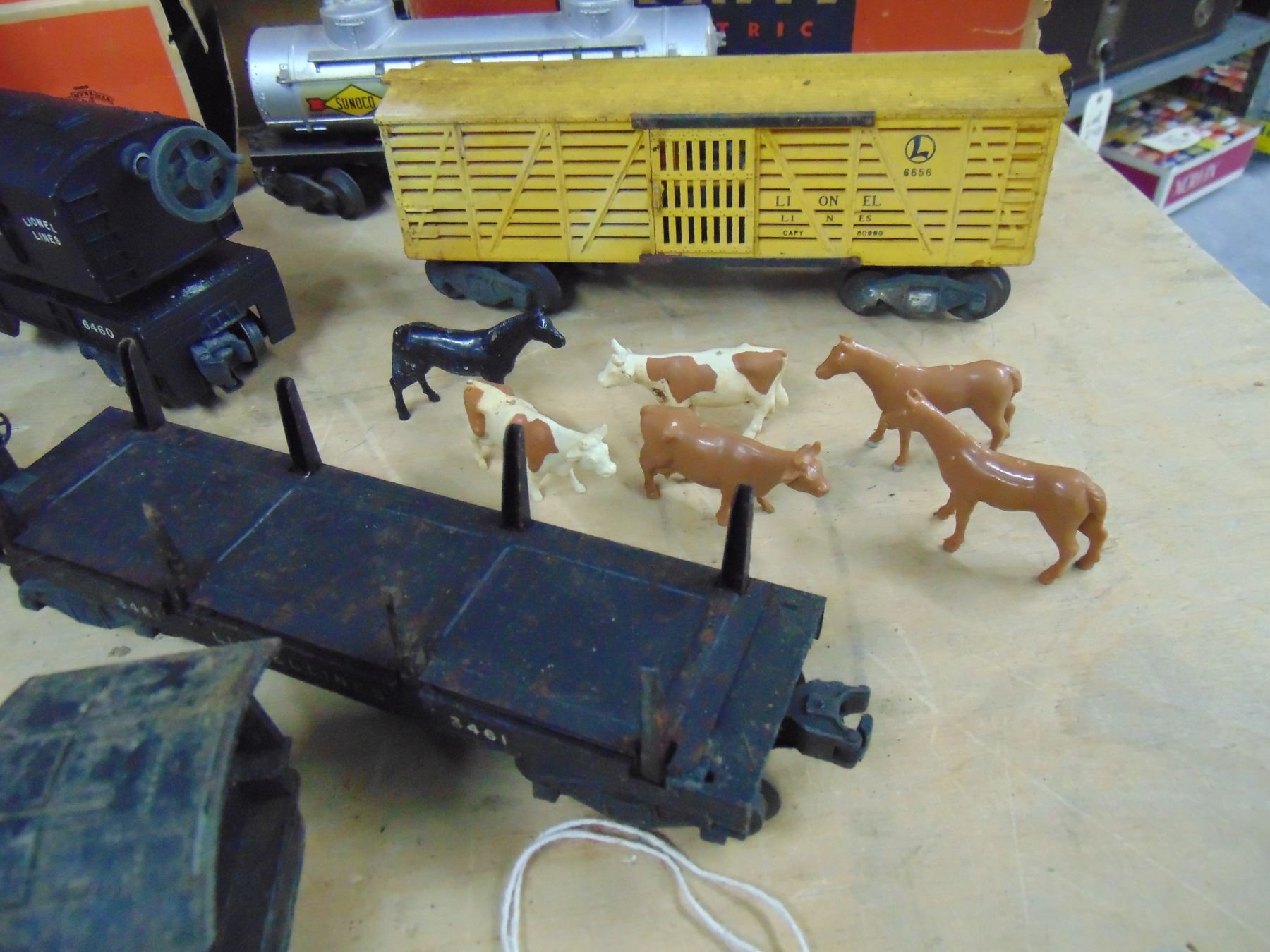 Flat of 6 train cars and parts; engines, cars; some with boxes