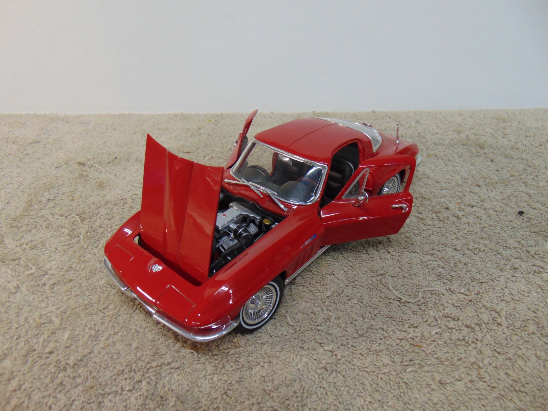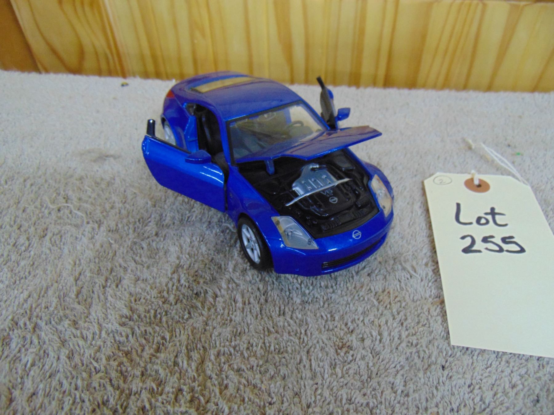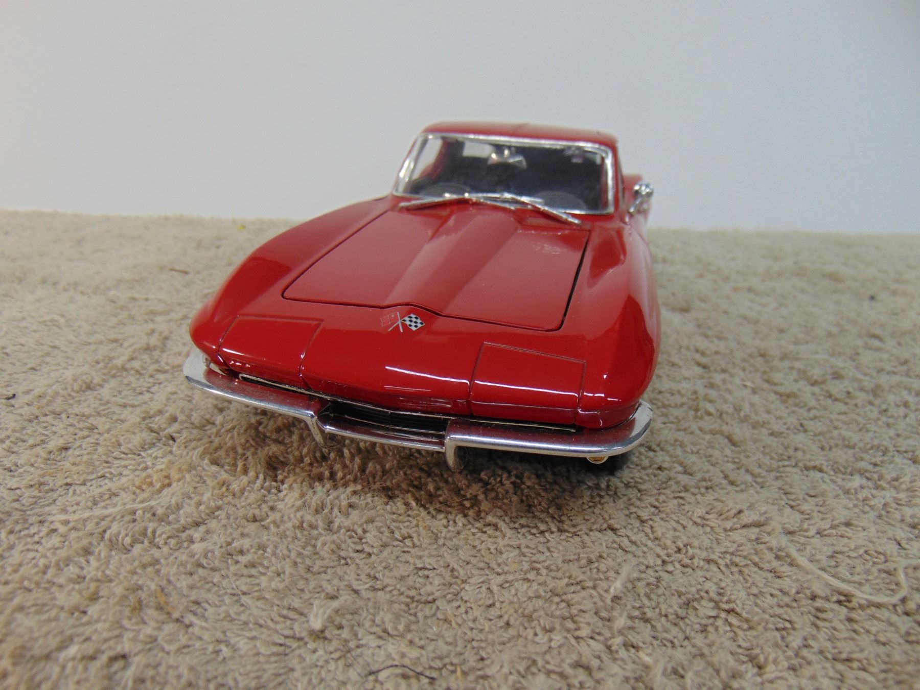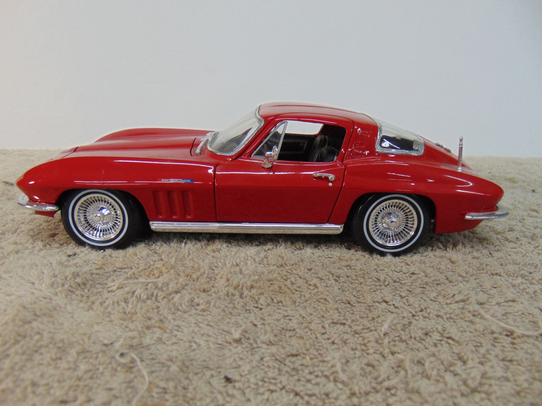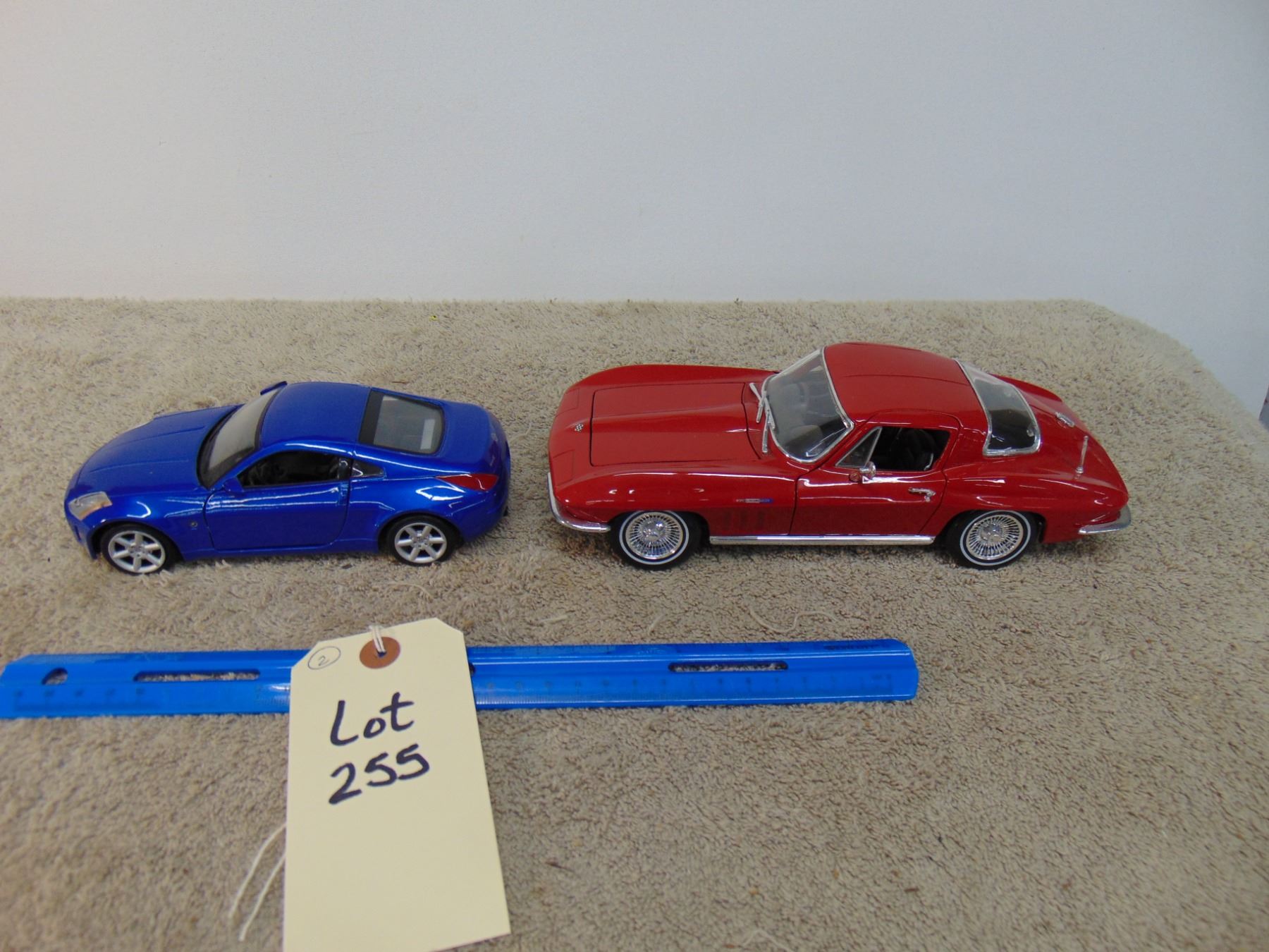 Two Precision die cast metal cars: 1) 1:24 Nissan 350Z; 2) 1:18 Chevrolet Corvette, circa 1965, missing one rear bumper