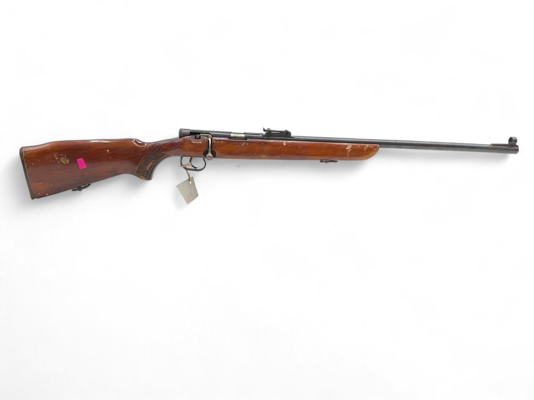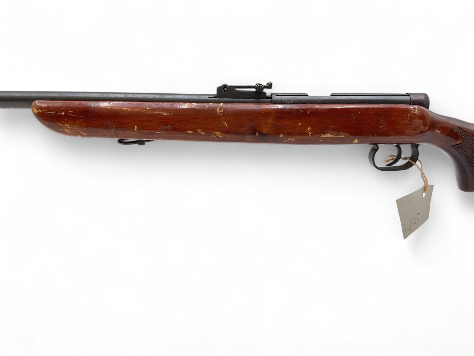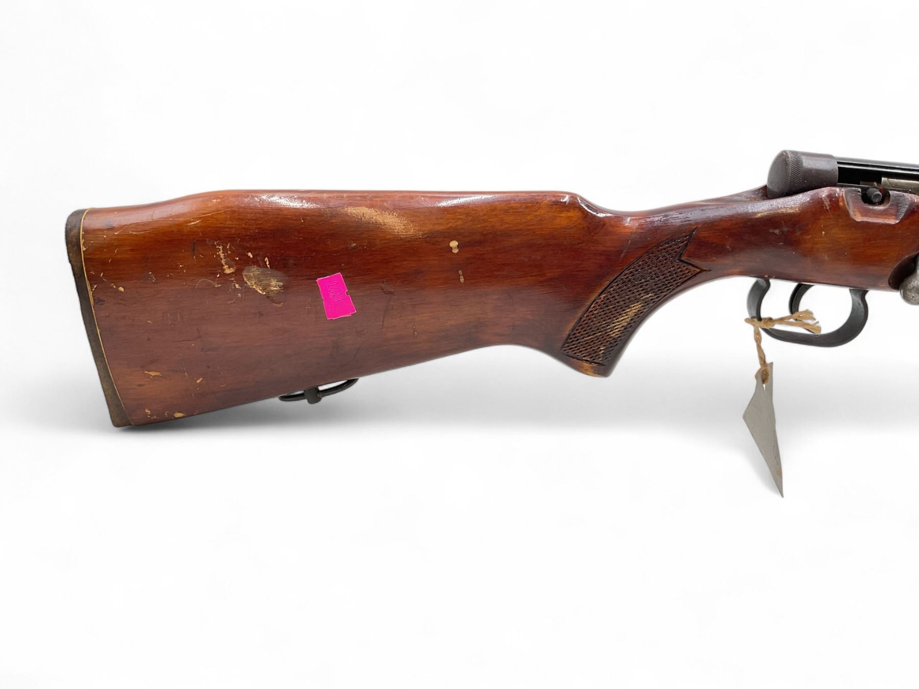Toz-8-01 Single Shot Bolt Action Rifle .22LR 25" Barrel Wood Stock. Hooded front sight, adjustable rear sight. Rear stock cracked near bottom. This is a non-restricted firearm.