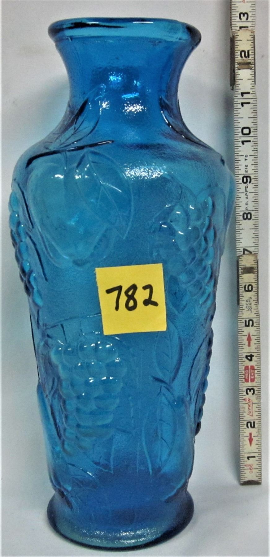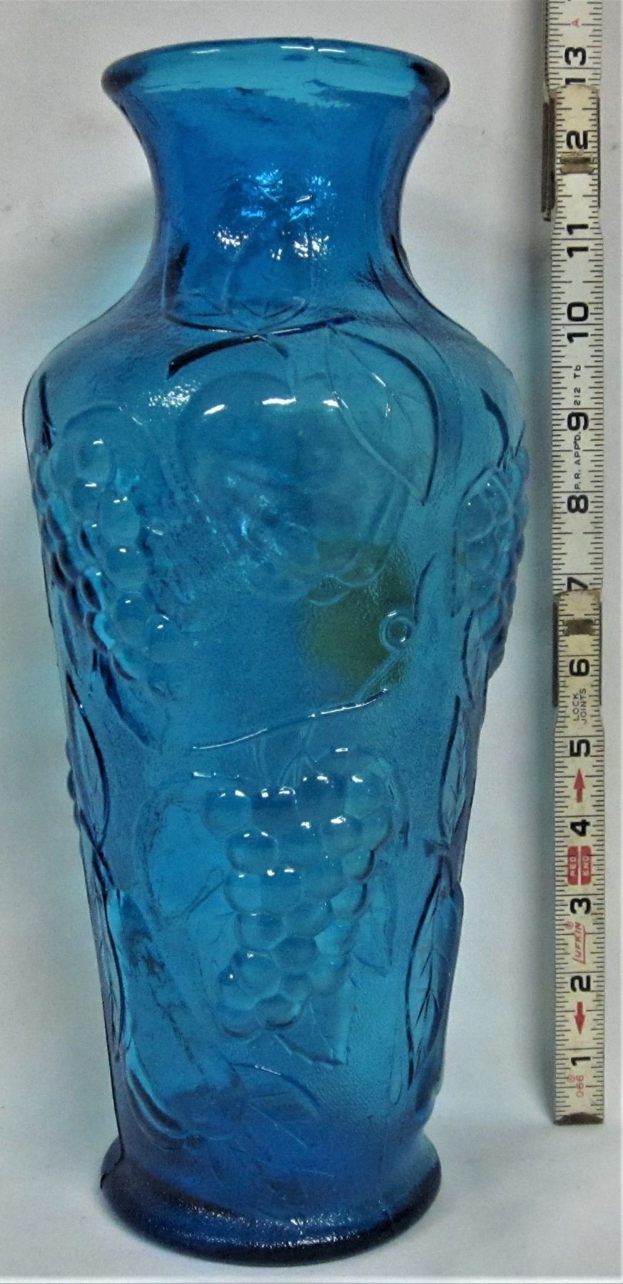 Tr. Blue 12.5" glass vase embossed with grape clusters