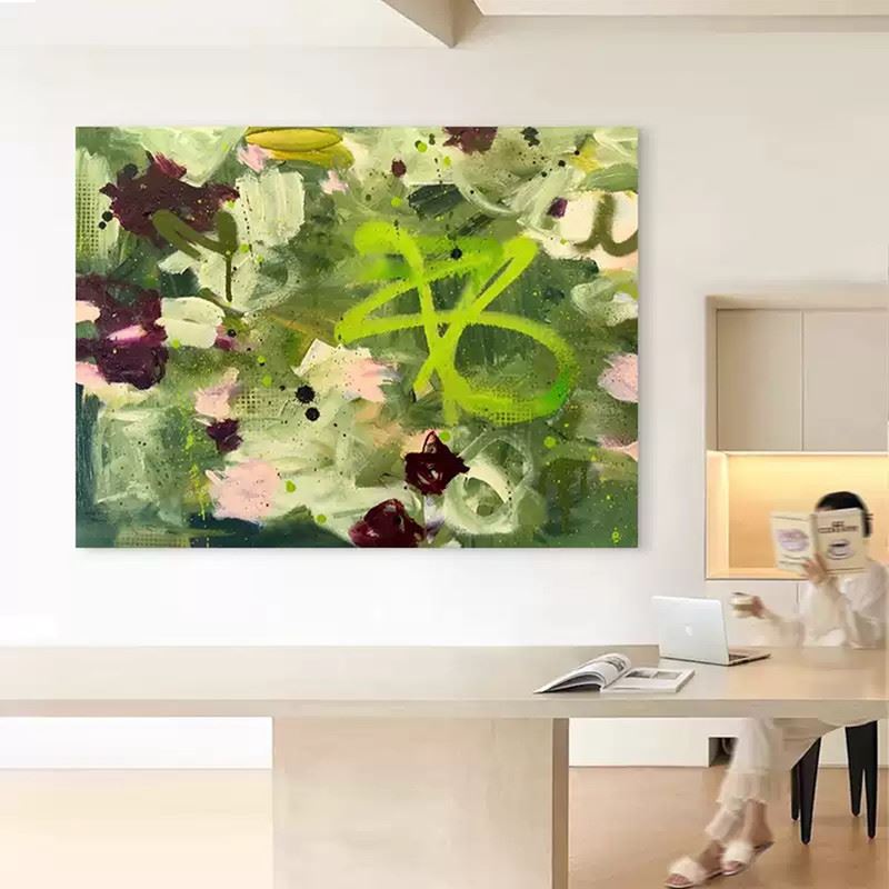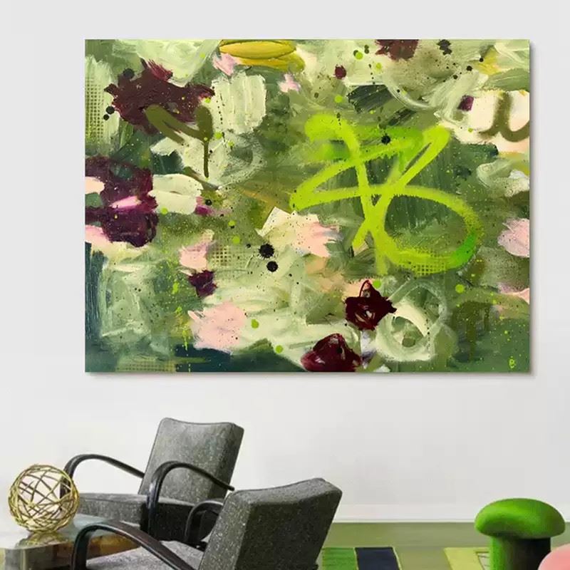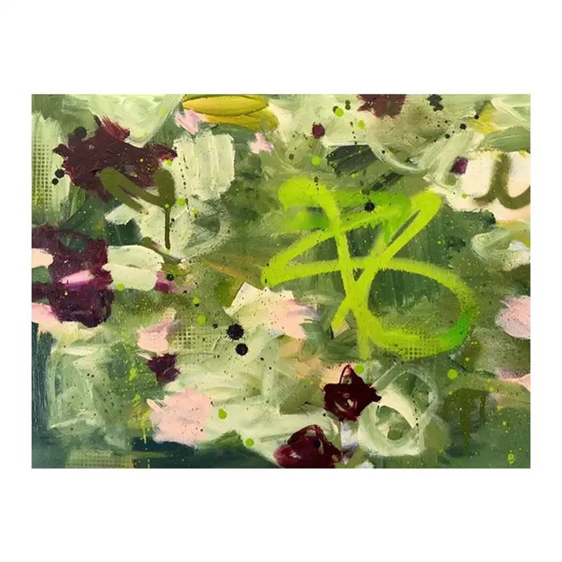 Layers of soft greens mingle with deep purple accents, crossed by a bright streak of green—like a spontaneous mark left in nature. Dimensions: 31 x 24 inches.