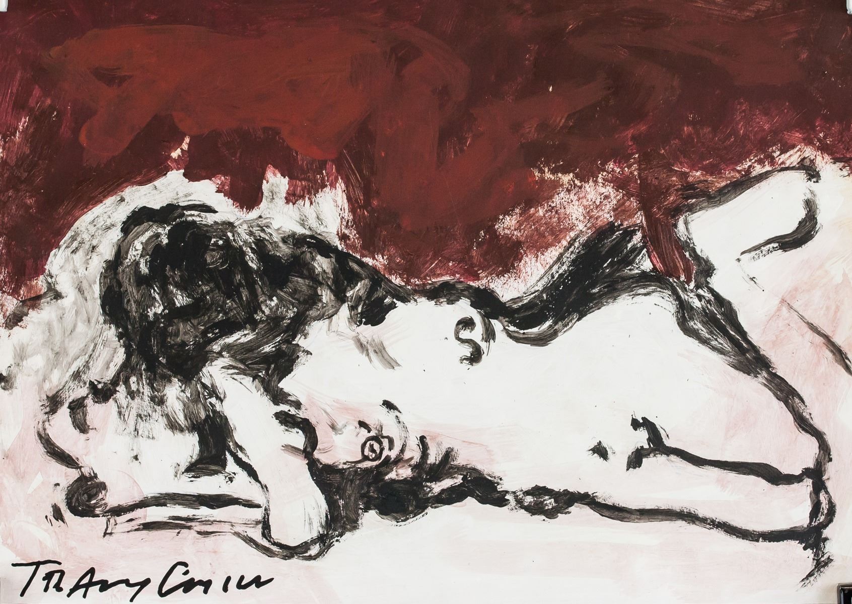 Mixed media on paper. Featuring a nude portrait. Signed Tracy Emin on the lower left corner. Inscribed 09 and stamped FINE ARTS LONDON SEAL R.N. 387 on verso. Attributed to Tracy Emin (born 1963, British). 20 x 28 cm (8.0 x 11.0 inches). PROVENANCE: Southern Ontario estate