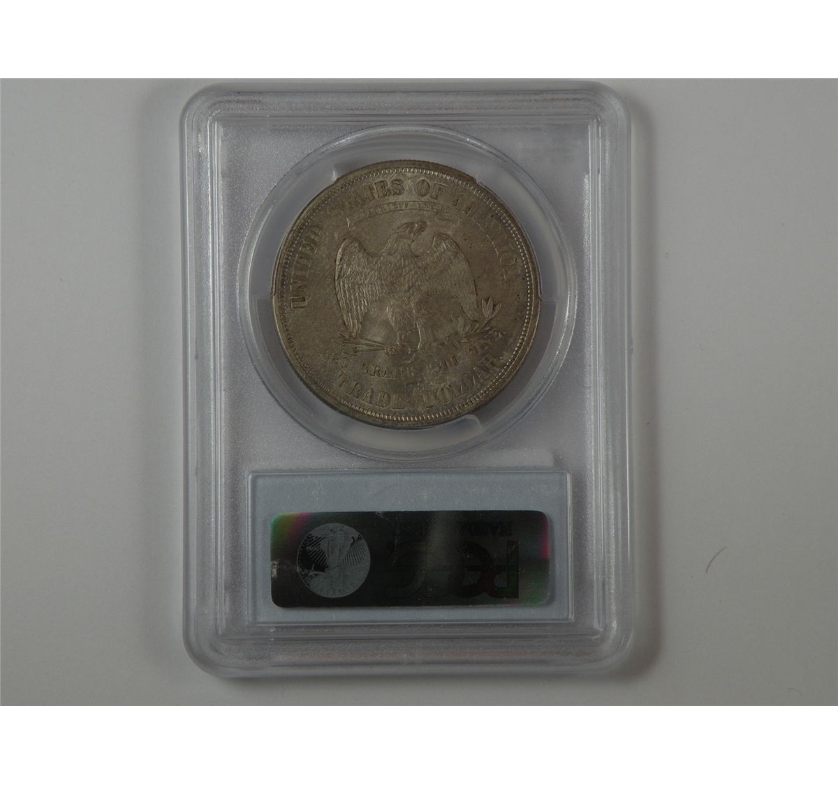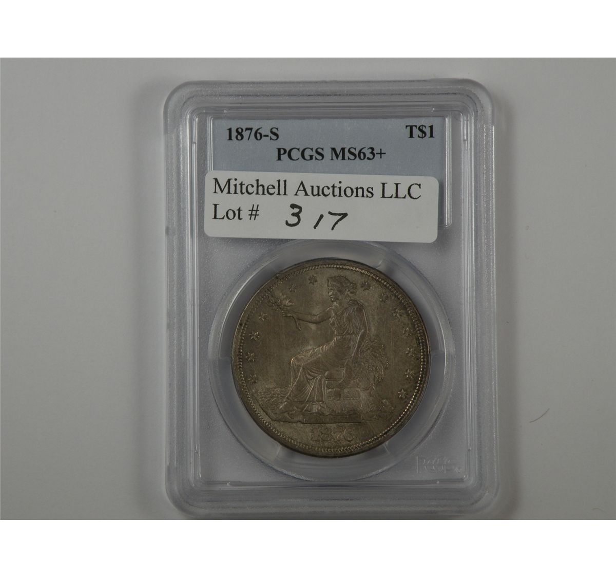 Trade $1 1876- S PCGS MS63+. The strike is bold and the fields are wonderfully smooth for a coin of this type. In fact, were it not for a shade of russet- grey and lilac iridescent toning that somewhat subdues the lustre, a higher grading would have been warranted. Quite scarce this nice. Est.$1,750
