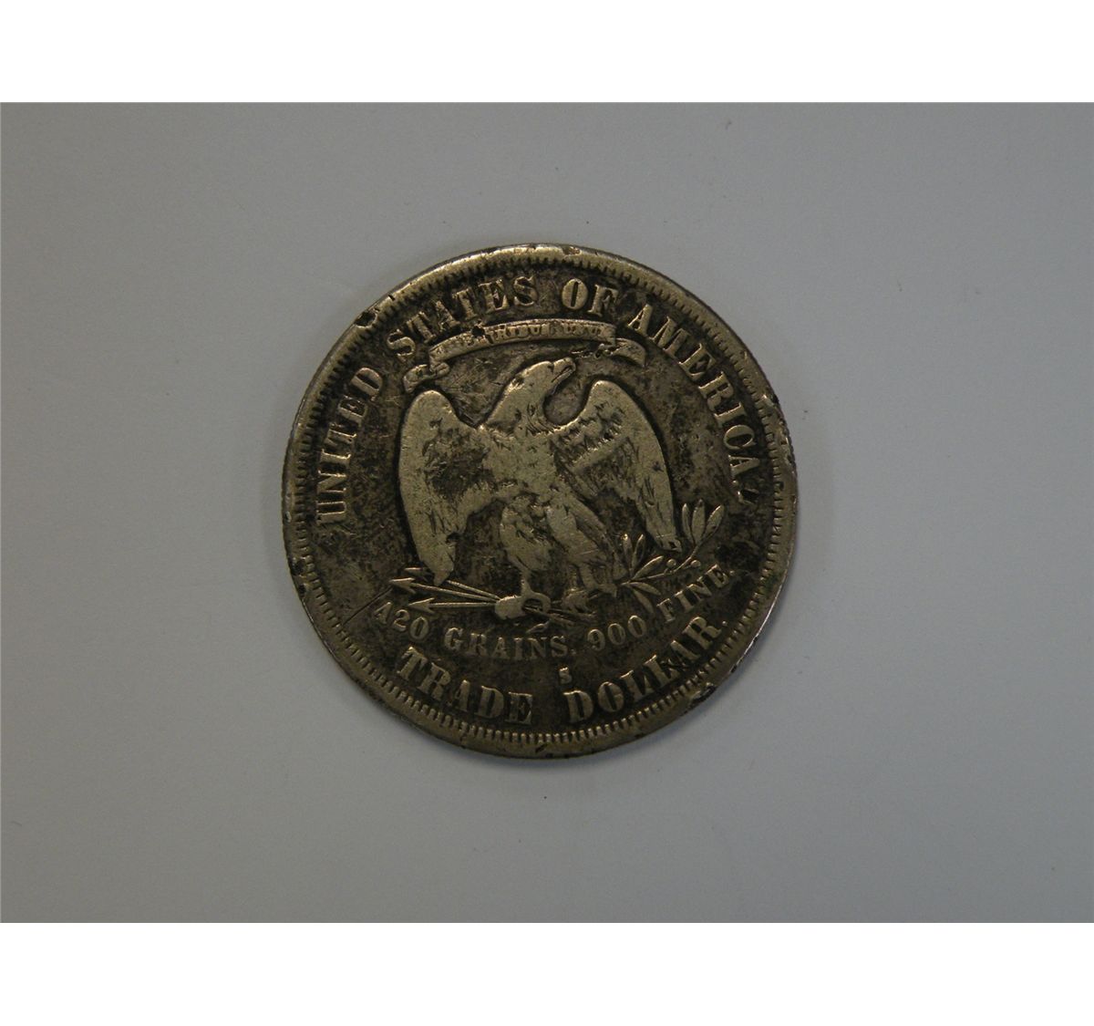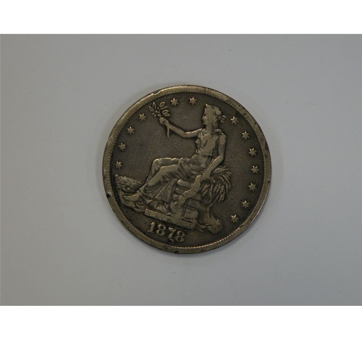 Trade $1 1878-S. VG/Fine with respect to wear. Scattered rim marks on either side. Est$90