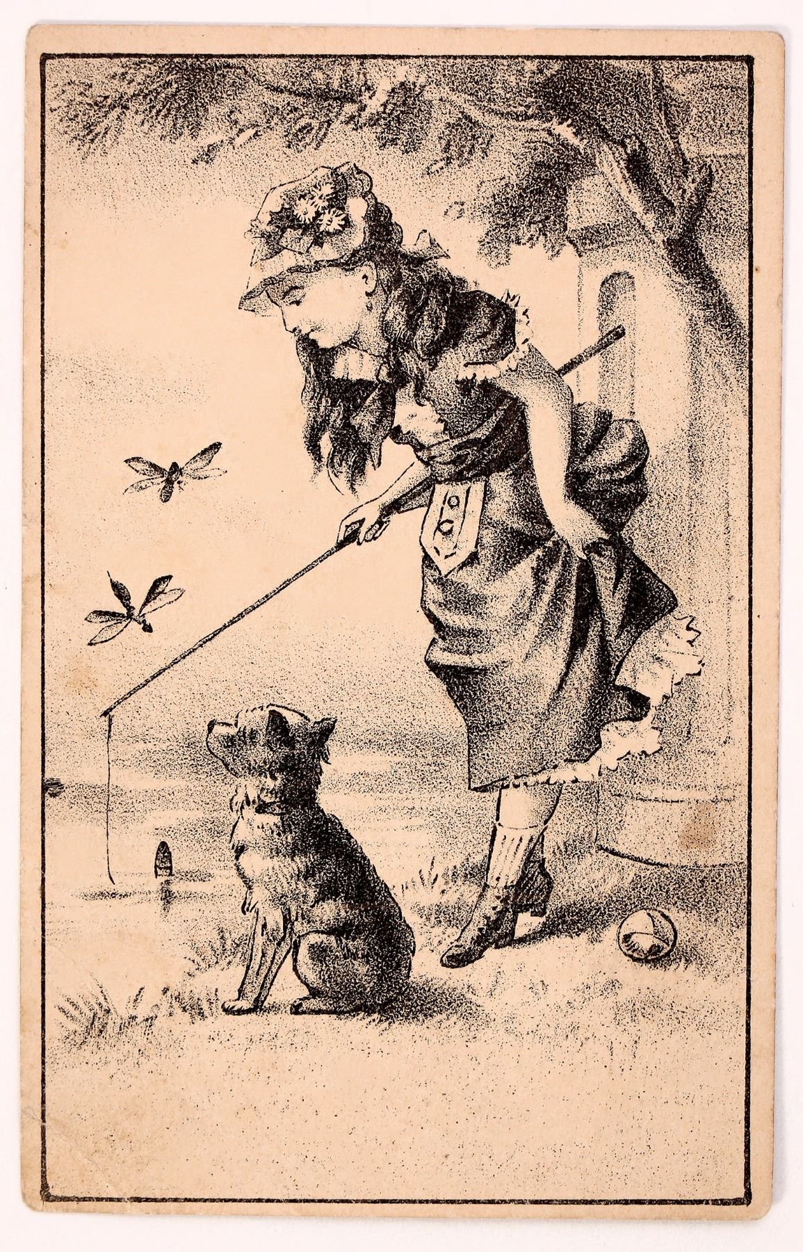 Trade card, with text, ROLLER SKATING RINK./ 100 EUCLID AVENUE./ Great Attractions for week of Feb. 18th... possibly from Cleveland, Ohio. Black and white illustration of girl fishing with her dog. 2.75" x 4.25".