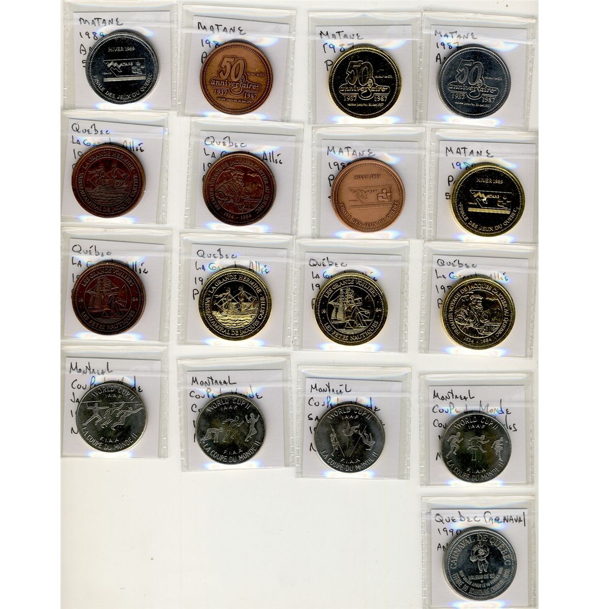 Trade Dollars; Mix lot of Quebec issues (non silver). Includes issues from Matane 1987& 1989(3 ea. diff metals), 1984 Quebec Grande Allée (3xPO, 3xPB), 1979 Montreal World Cup II(4) & 1990 Carnival. 17 pcs.