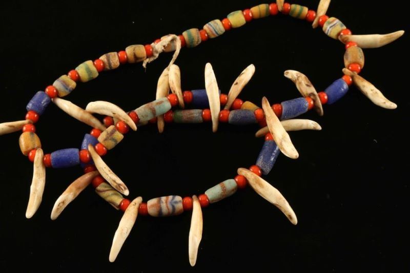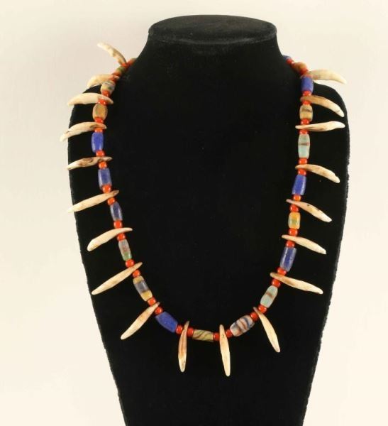 Coyote teeth and trade beads. In Riker mount with red felt background. Measures 16 1/4"x12 1/4".