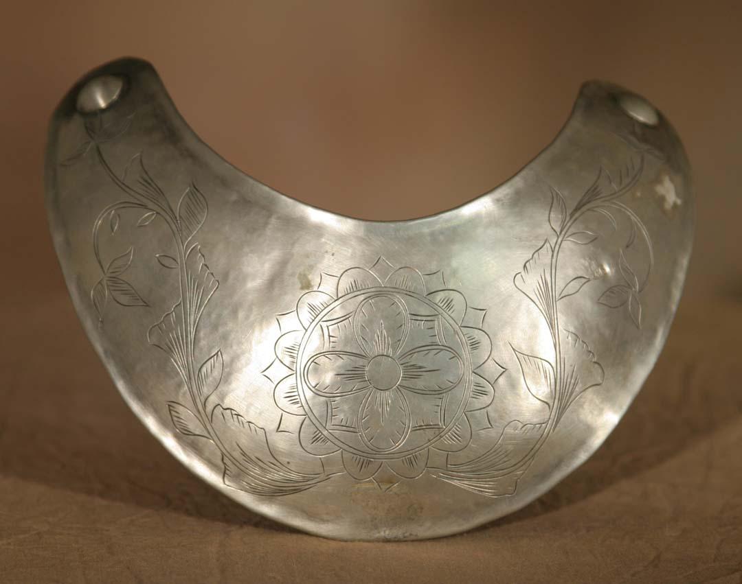 Trade Silver Gorget. 5 1/2" x 2 ¾". With engraved design, hallmarked "RG". 18th century. (est $1,500-2,500). For condition reports please visit: www.auctioninsantafe.com/cr2011.pdf