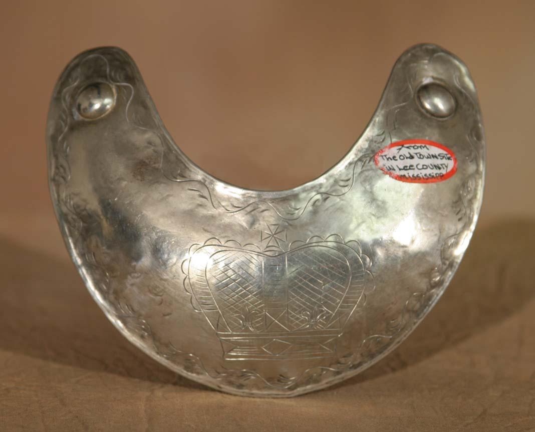 Trade Silver Gorget. 5" x 2 ¼". With engraved crown design. 18th century. (est $1,500-2,500). Additional Info: Tag reads "From the old town site in Lee County, Mississippi". . For condition reports please visit: www.auctioninsantafe.com/cr2011.pdf