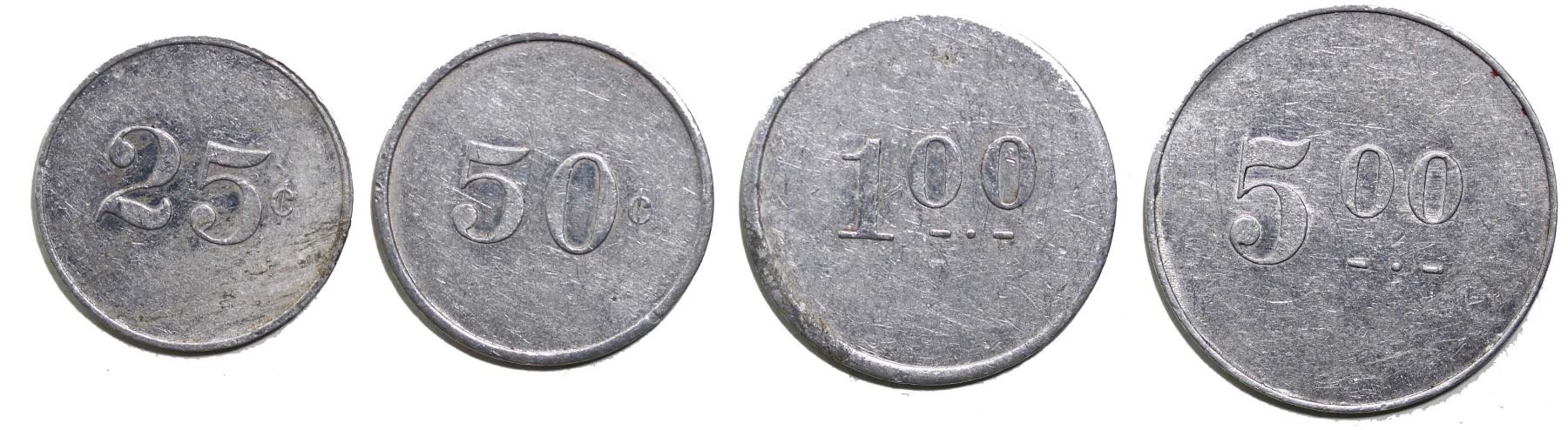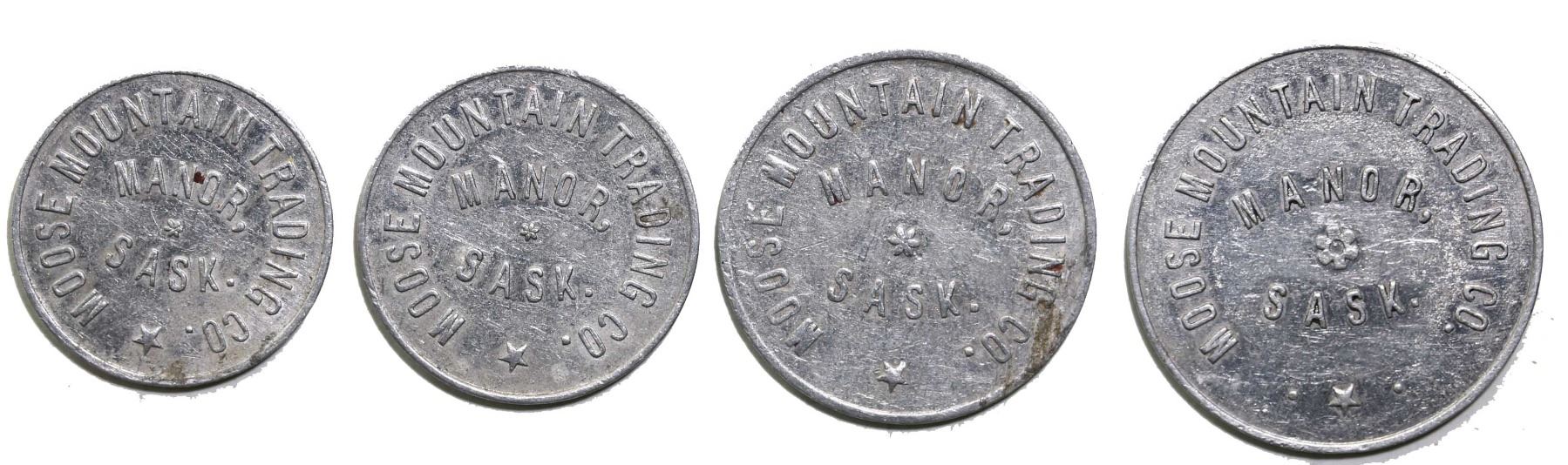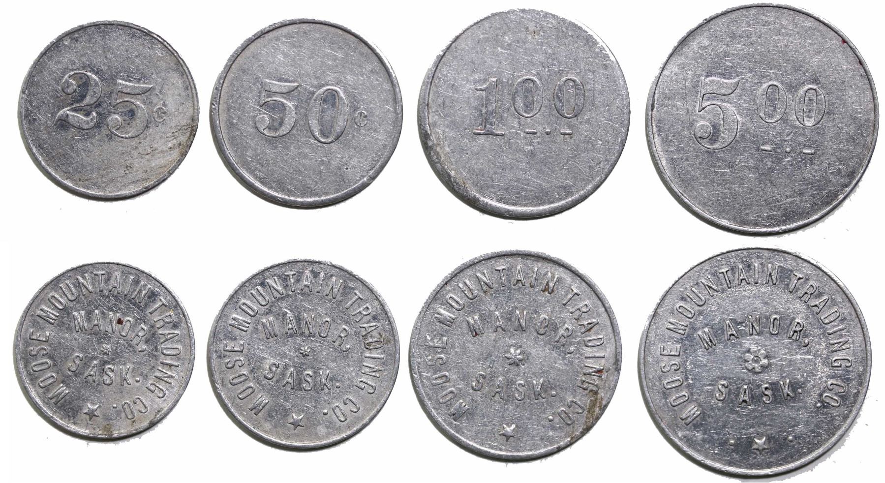 Trade Tokens; Moose Mountain Trading Tokens 25¢, 50¢, $1 & $5 #2751b, d, e & f. examples. Rare Set