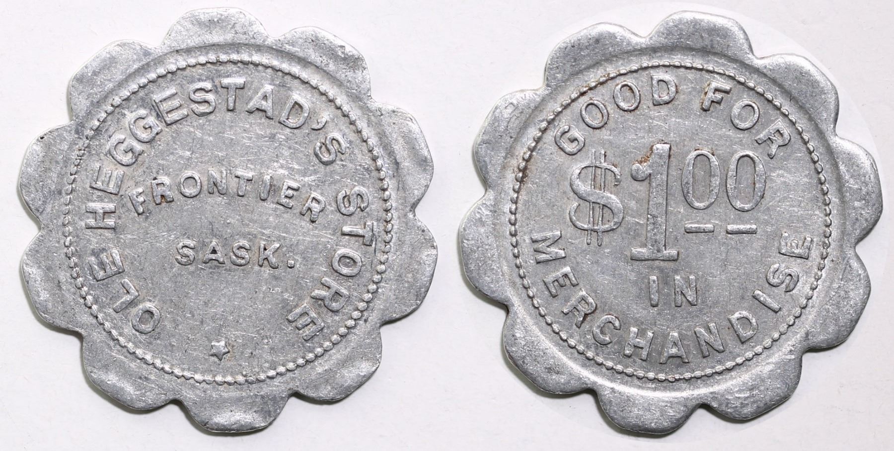 Trade Tokens; Saskatchewan - #1705d Frontier, SK - Ole Heggestad's Store - Good For $1 Merchandise aluminum example.