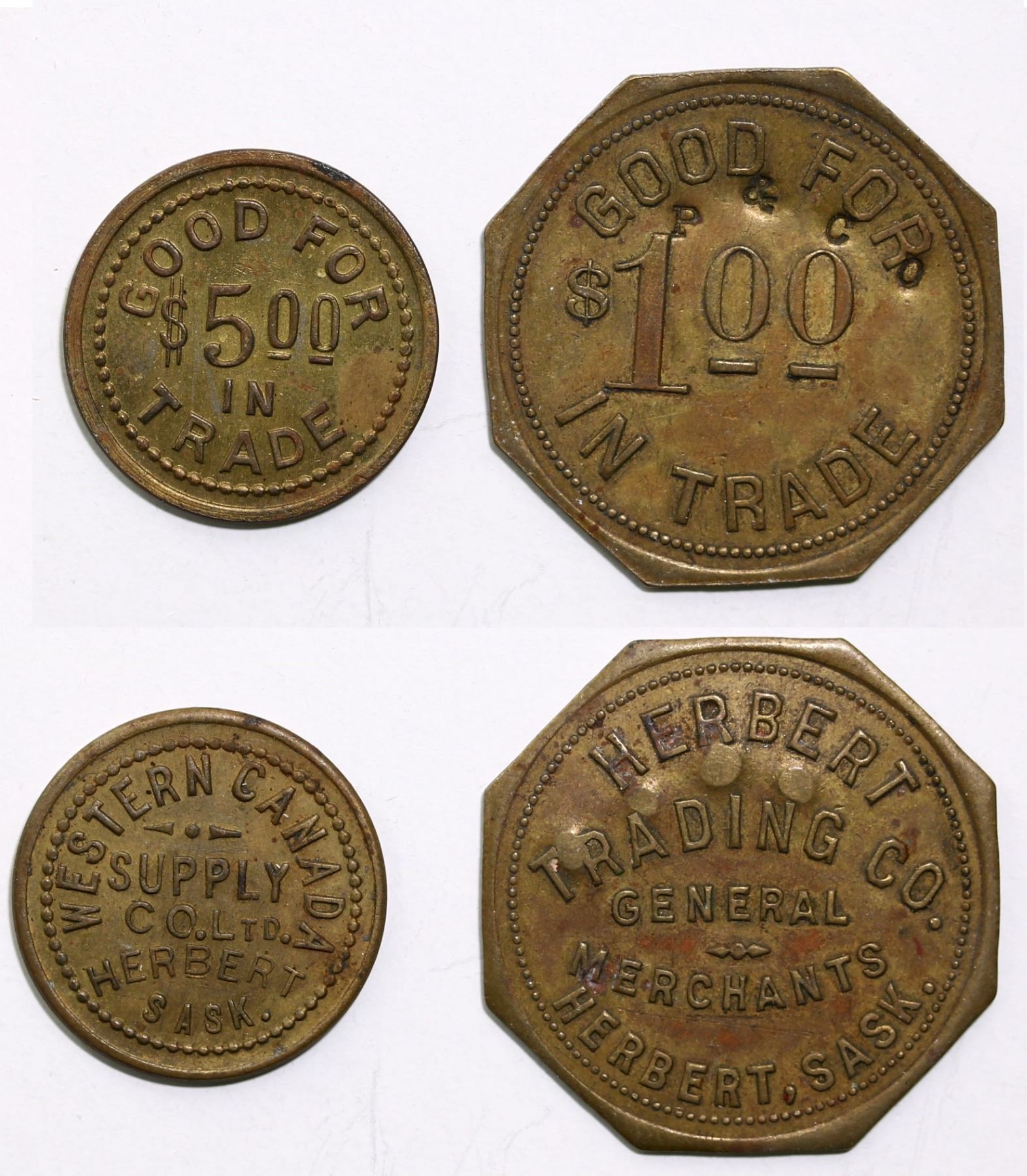 Trade Tokens; Saskatchewan - #2161b & 2161d Herbert, SK - Herbert Trading Co. - Good For $1 & $5 inTrade example. Lot of 2 pcs.