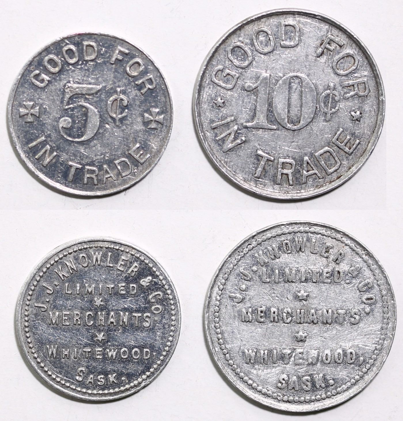Trade Tokens; Saskatchewan - #7220 & #7220H Whitewood, SK - J.J. Knowle & Co. - Good For 10¢ & 5¢ in Trade aluminum issues. Lot of 2 tokens.
