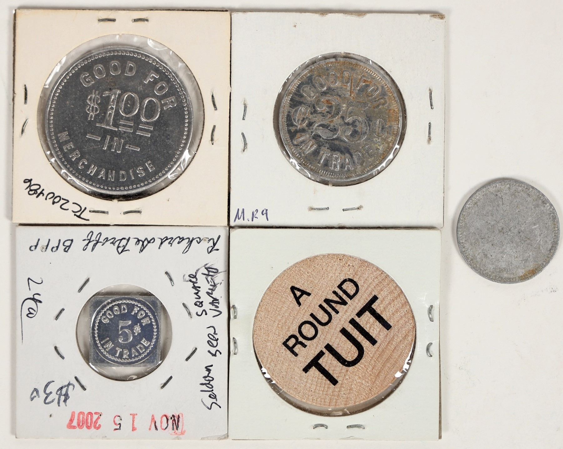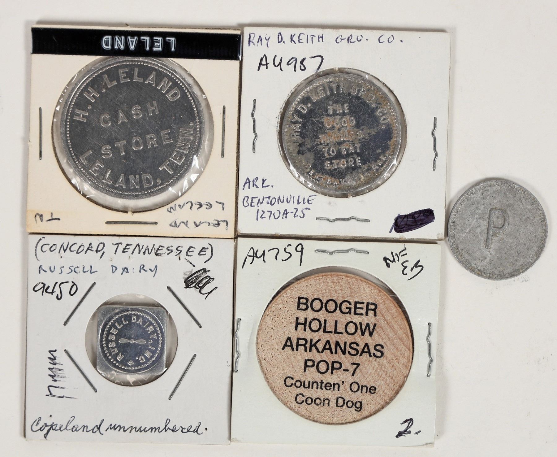 A group of five trade tokens from Florida, Arkansas, and Tennessee. Lot includes four metal tokens and one wood token with a comedic inscription. Varying condition; see photos.