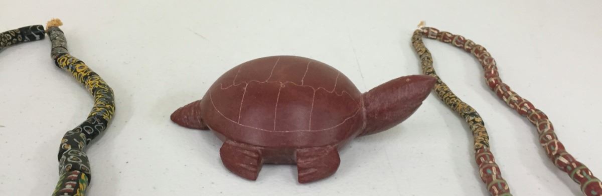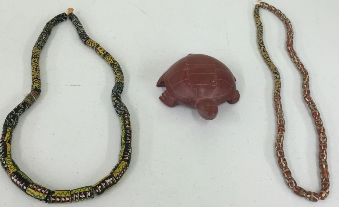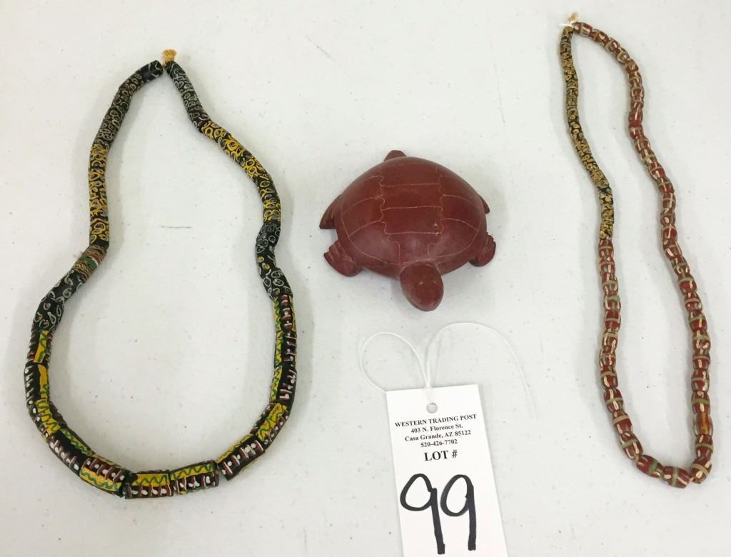 There are two trade bead strands measuring approx. 24” long each. There is also a hand carved Pipestone turtle by Wynona Brian, Chippewa, which is approximately 6” in length. Please look closely at pics as they are an important part of our description. Shipping: There will be a $7 handling / packaging fee for shipping this lot. The actual cost of postage will be added on top of that.