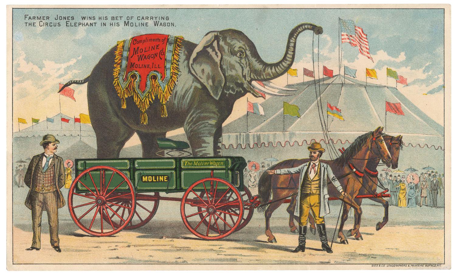 Trade card, Moline Wagon Co.-Moline, IL, large card w/colorful circus graphics by Gies & Co. Lithogr