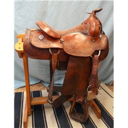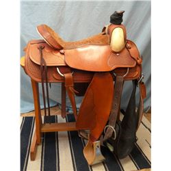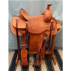 Morris Saddlery, 15", association, flat plate double rig, rough out, rawhide bound cantle & horn, brand new