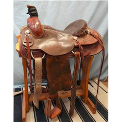 Hereford, 17", roping saddle, double rig, basket stamp, bell stirrups, lightly used