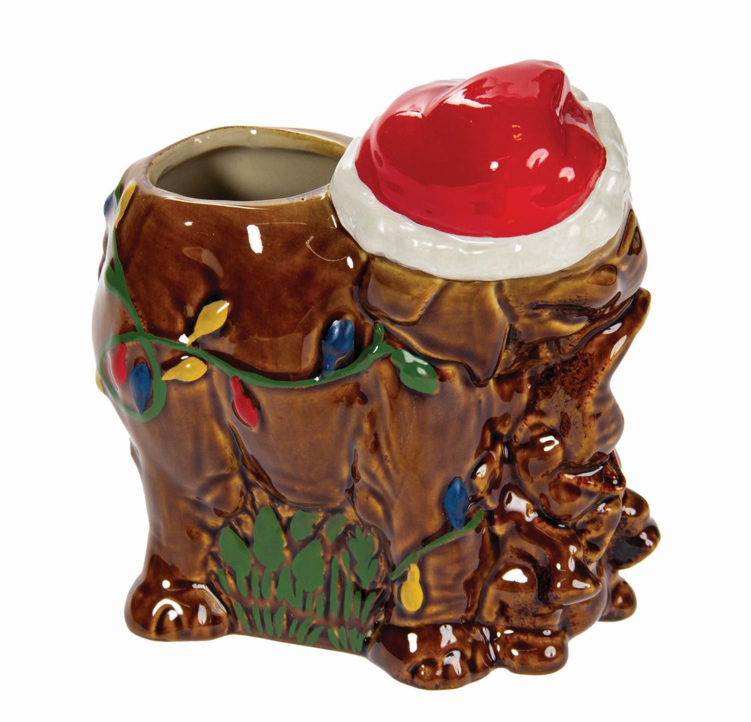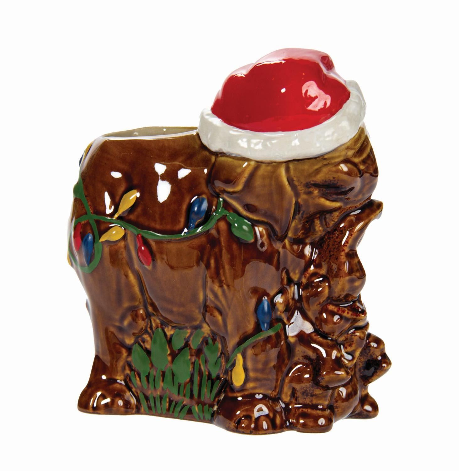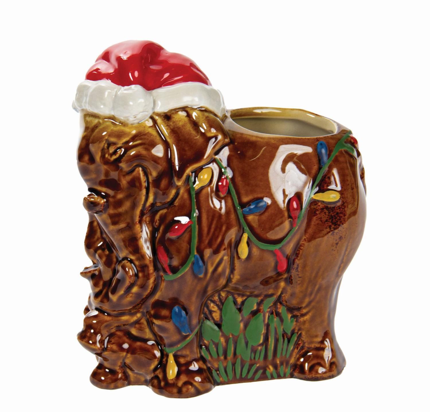 (Walt Disney World, 2017) A first edition tiki mug from Trader Sam's Grog Grotto at Walt Disney World. Inspired by the "Jingle Cruise," the holiday re-theming of the Jungle Cruise, the mug is in the form of an elephant wearing a Santa hat and draped in Christmas lights. The original cardboard box packaging is included. The mug measures 6.25"x5.5" and 2.75" deep and is in very fine, as-new condition. The box exhibits some staining to the lid.