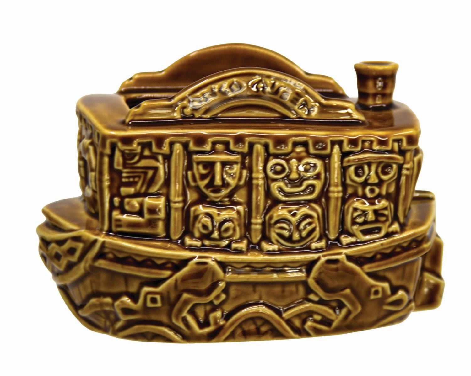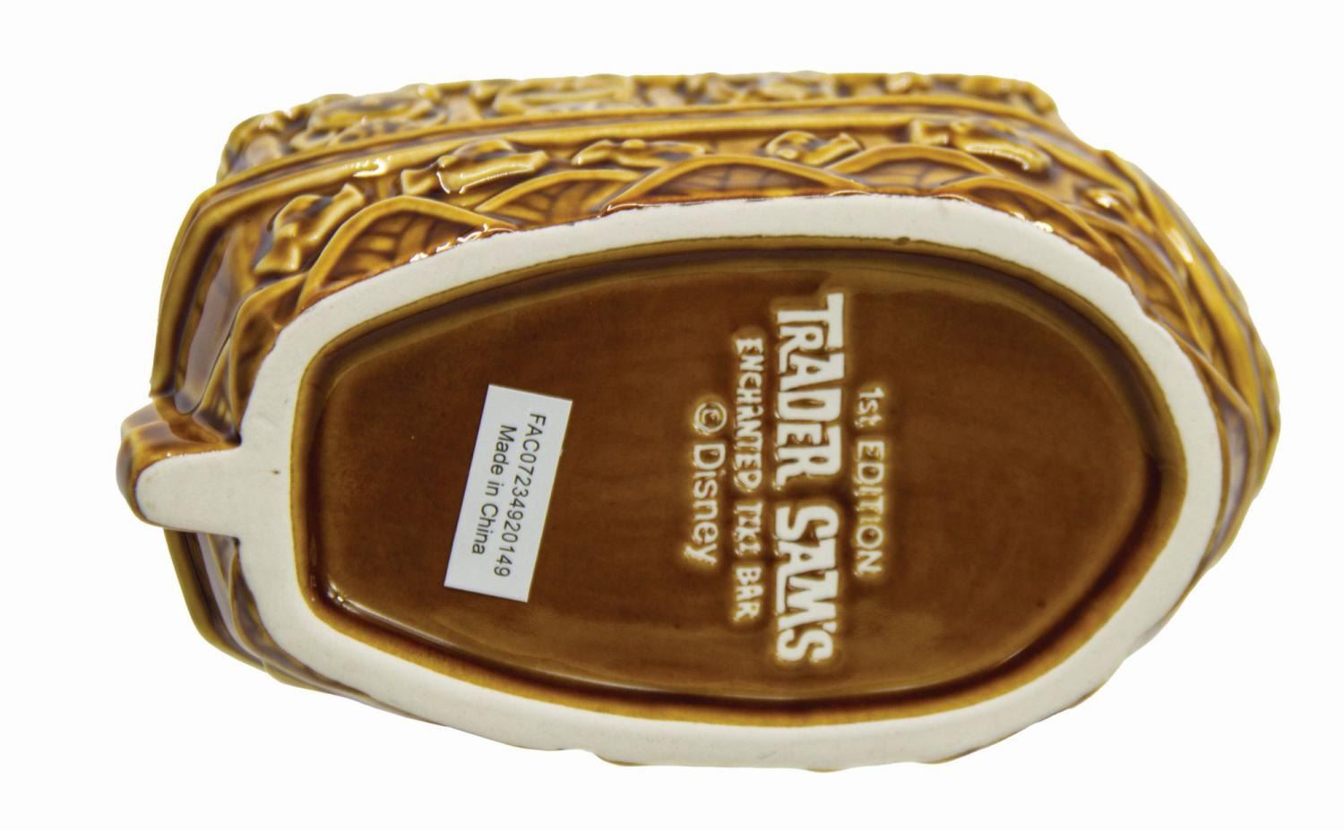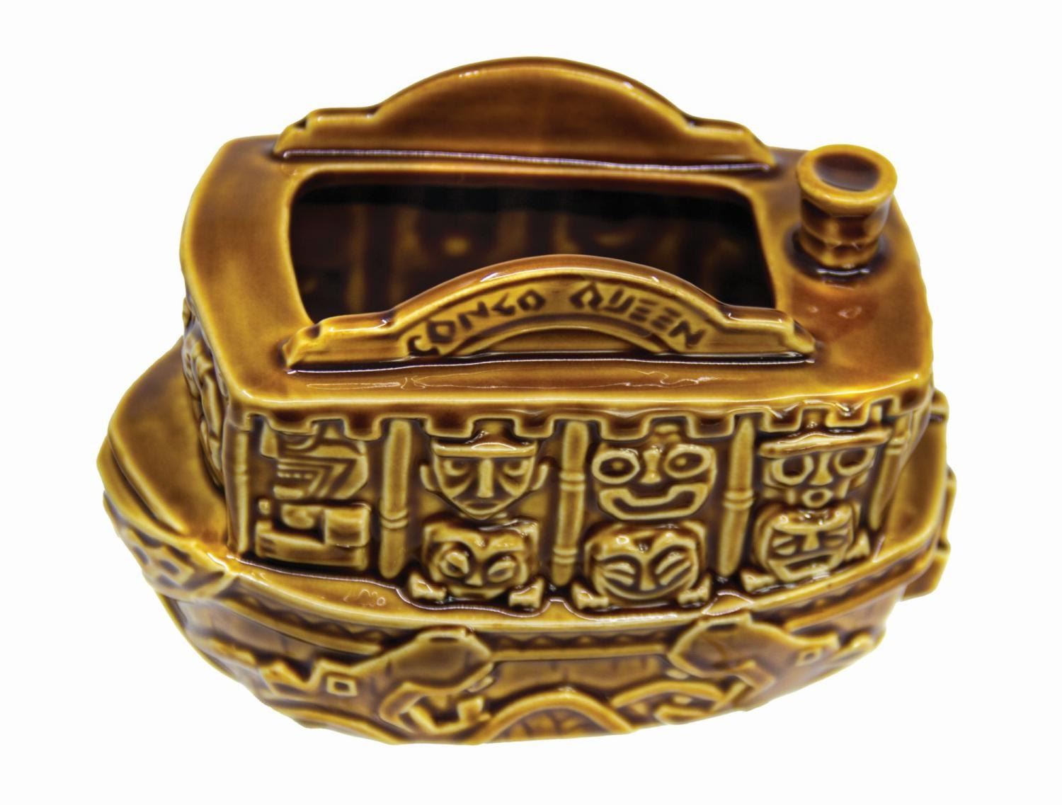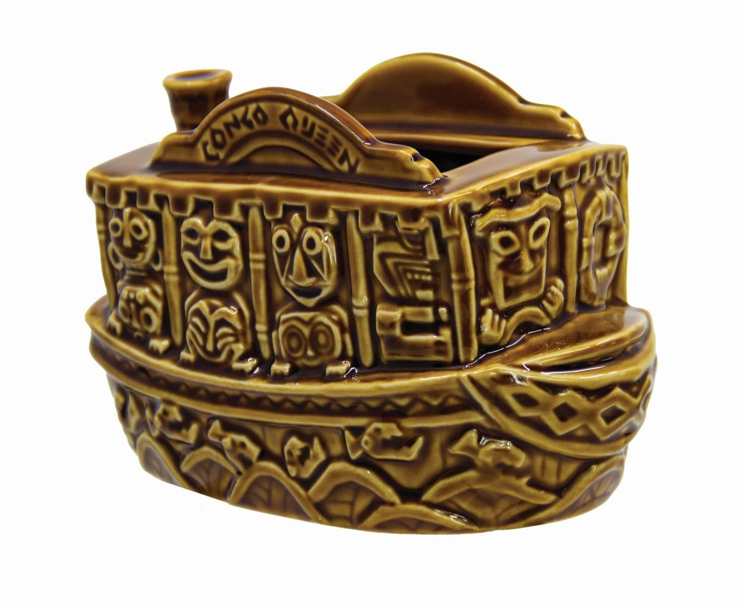 (Disneyland, 2021) A limited edition Congo Queen Jungle Cruise film Tiki Mug, released in limited quantities through Trader Sam's Enchanted Tiki Bar. These mugs were available for a limited time, at the Disneyland Hotel, via a reservation through the Disney App, completely selling out within an hour of their release. Patterned after the Congo Queen river boat, the ceramic mug totem is ornamented with hippos, piranhas, and native passengers, all finished with a classic brown glaze. Measuring 3.75"x5.75" and 3.25" deep, the piece is in fine, as-new condition, retaining its "1st Edition Trader Sam's Enchanted Tiki Bar" backstamp.