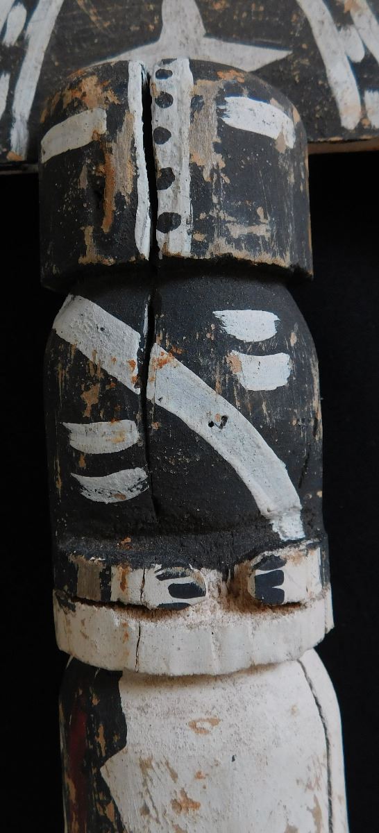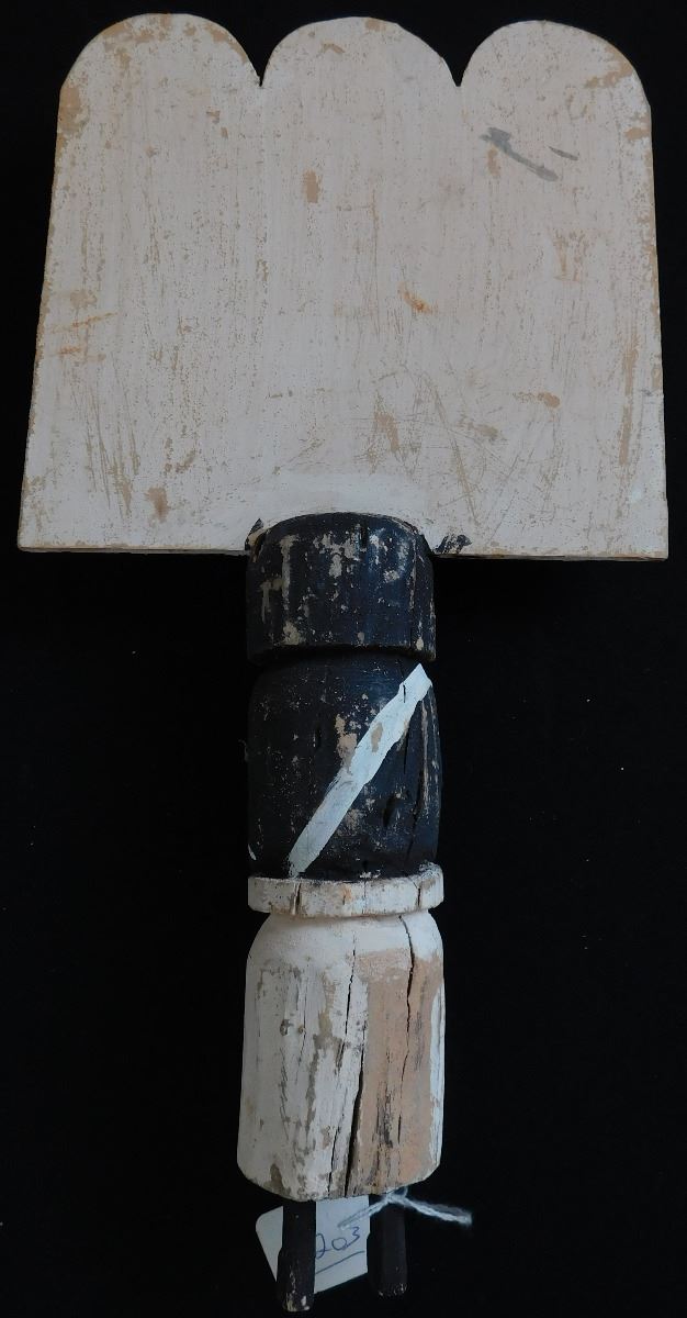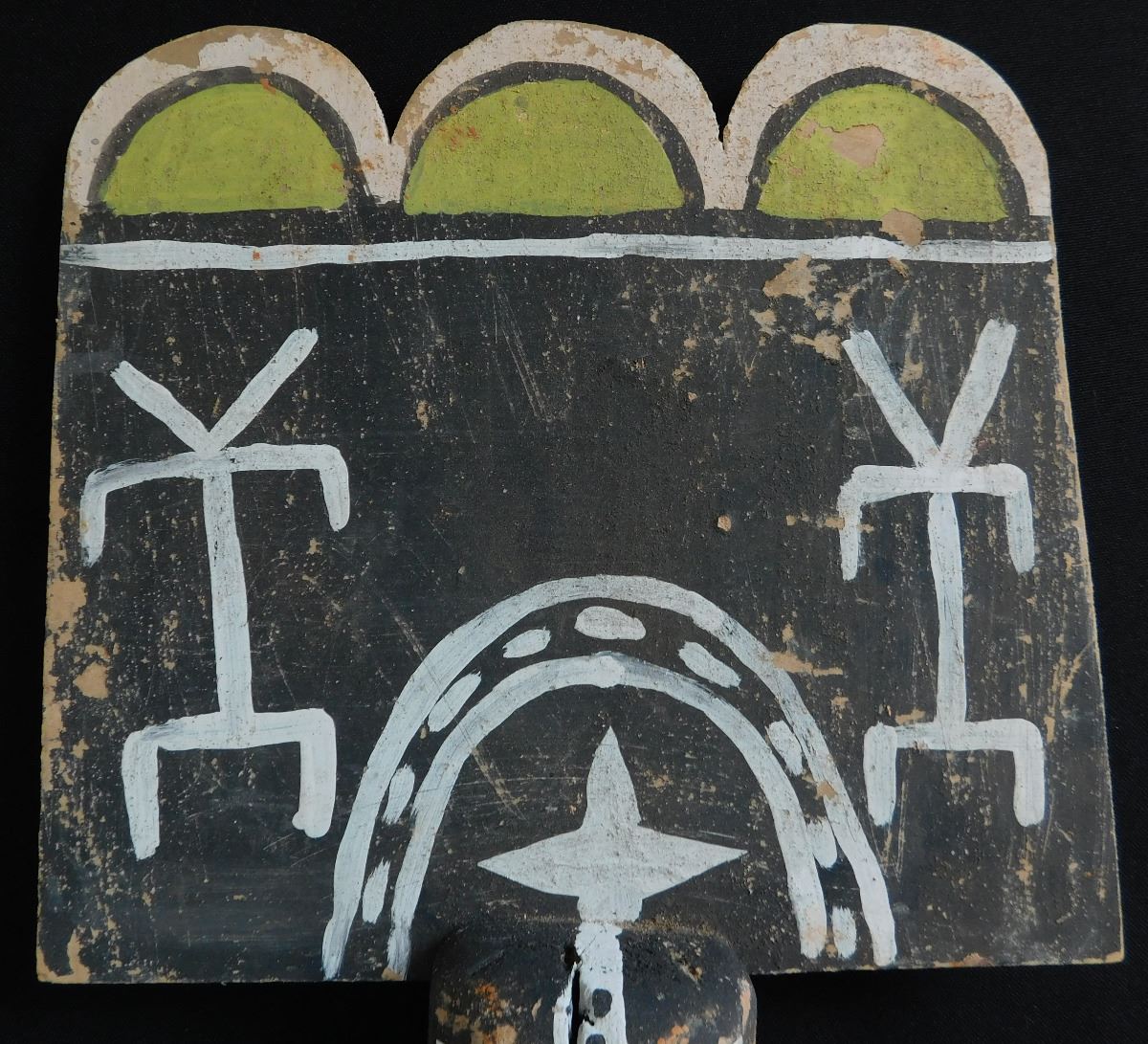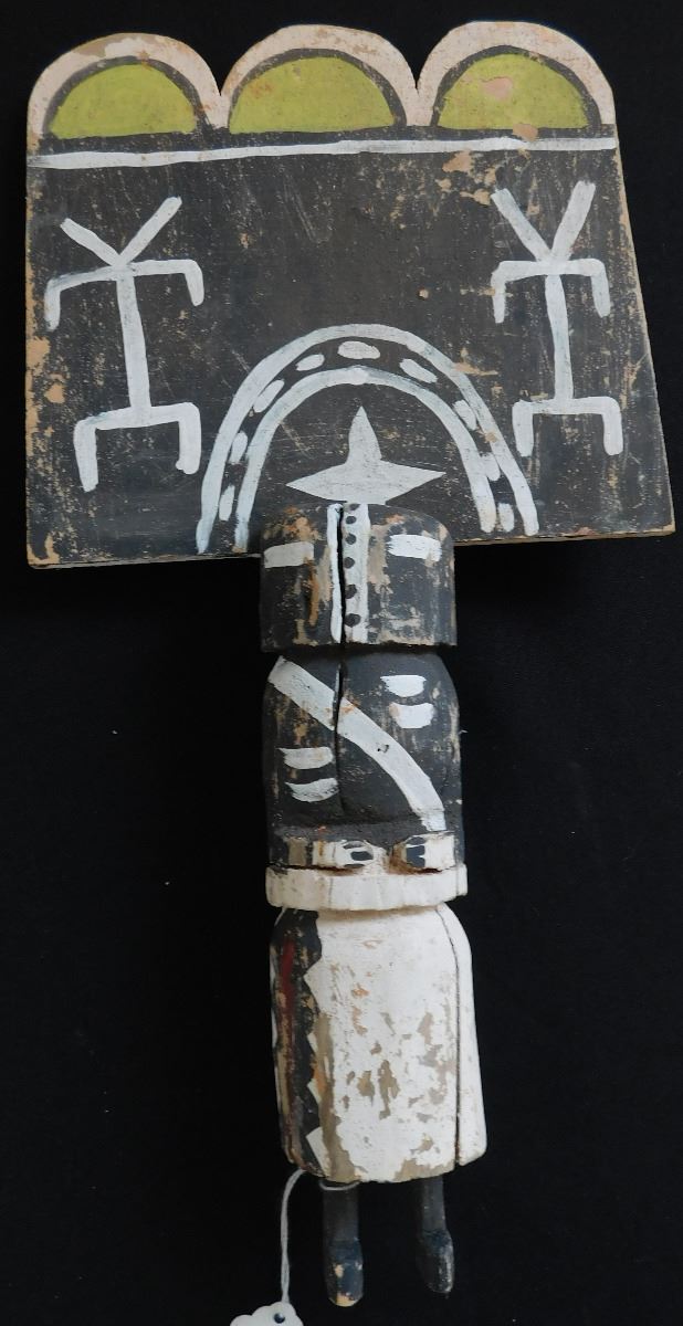 Trading Post Doll, circa 1940s. Made of cottonwood and measuring 15" x 8" x 3". From Holbrook, Arizona. Condition: Some wear and paint loss, see images. Shipping: $25.00, requires double-box.