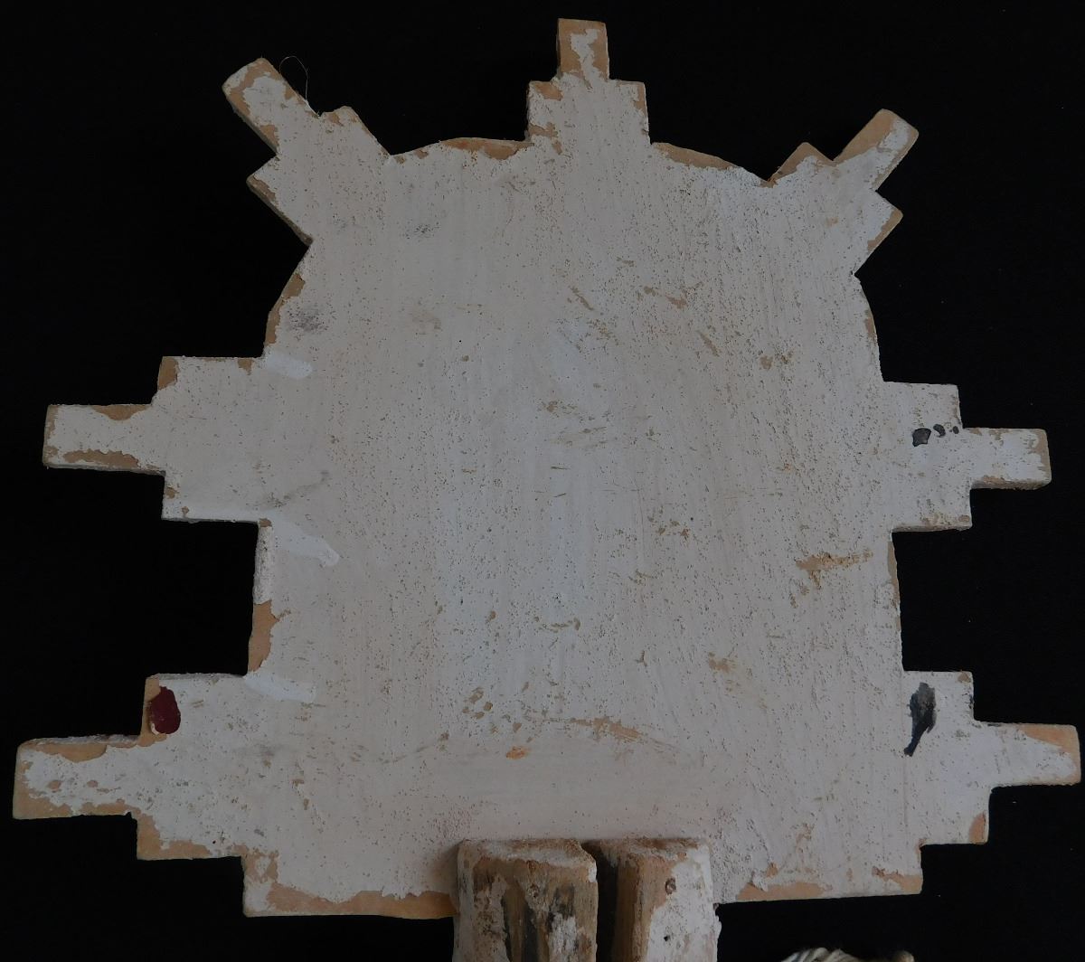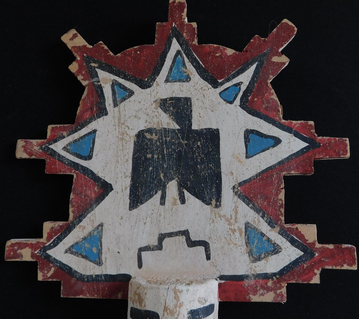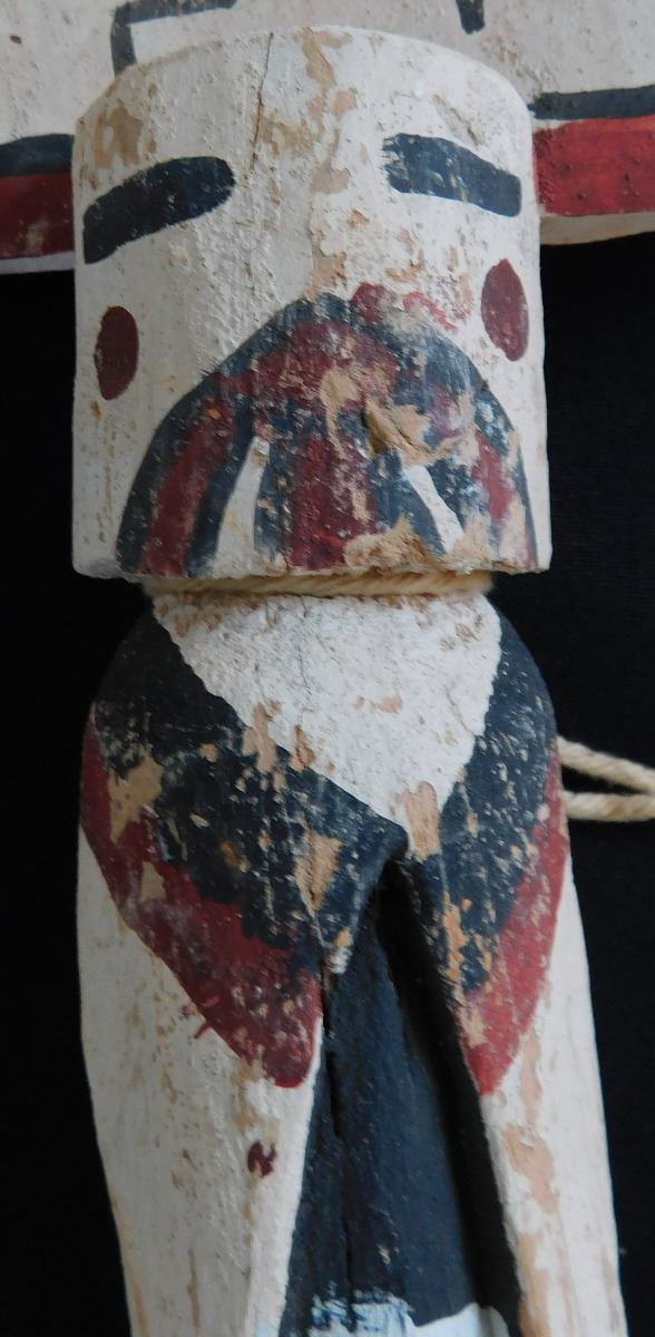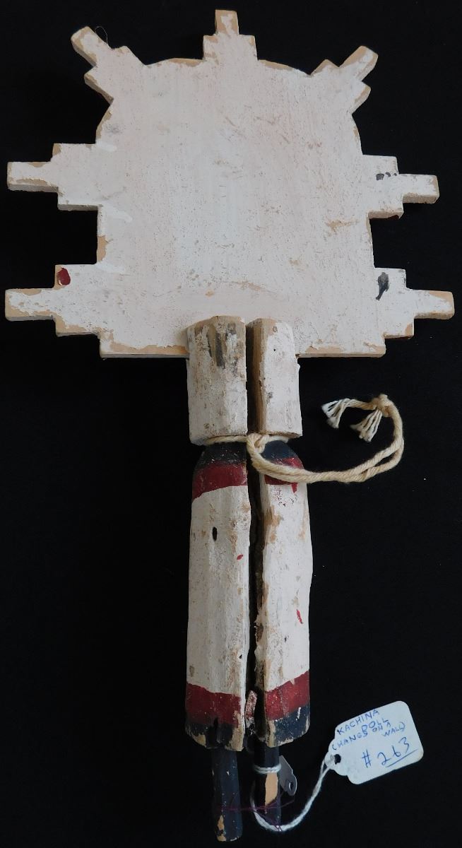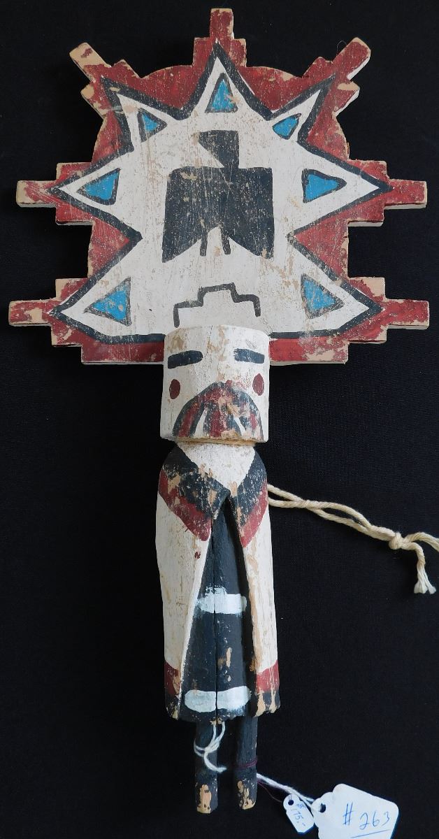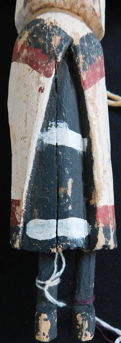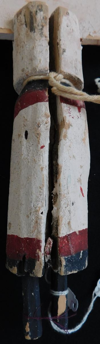 Trading Post Doll, circa 1940s. Made of cottonwood and measuring 15" x 8" x 2". From Holbrook, Arizona. Condition: Some paint loss and split on back, see images. Shipping: $25.00, requires double box.
