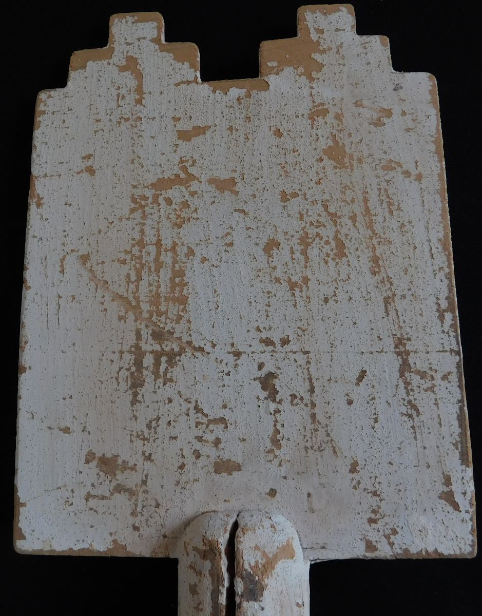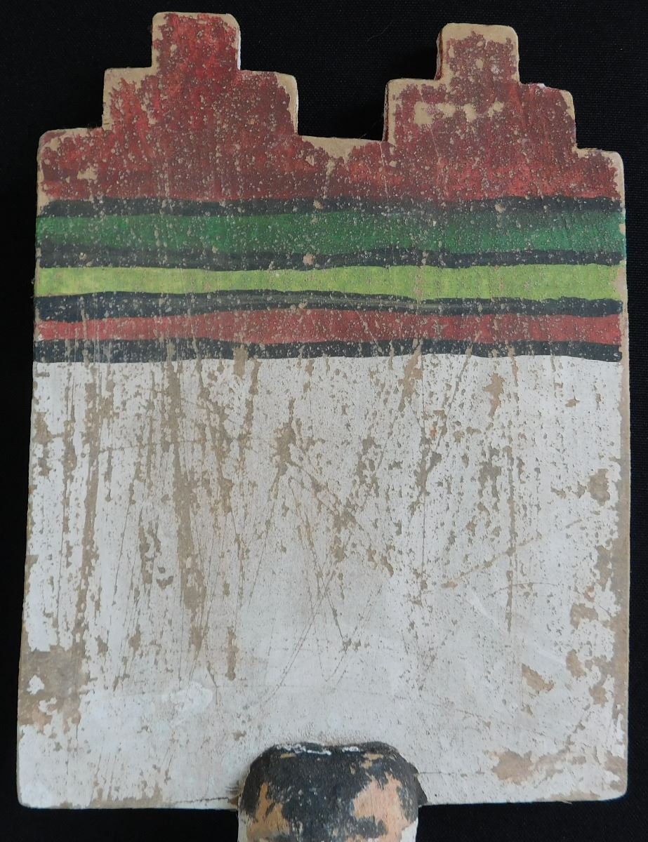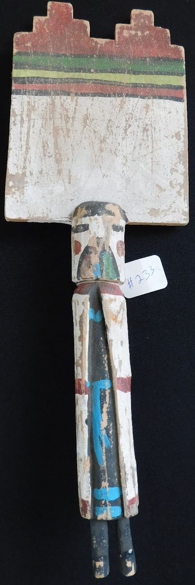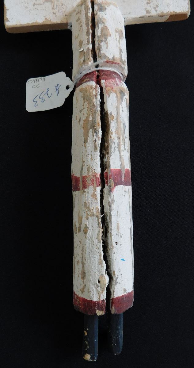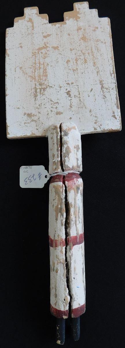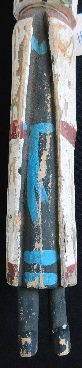 Trading Post Doll, circa 1940s. Made of cottonwood and measuring 17" x 5" x 2". From Holbrook, Arizona. Condition: Some wear and paint loss, split on back, see images. Shipping: $25.50, requires double-box.