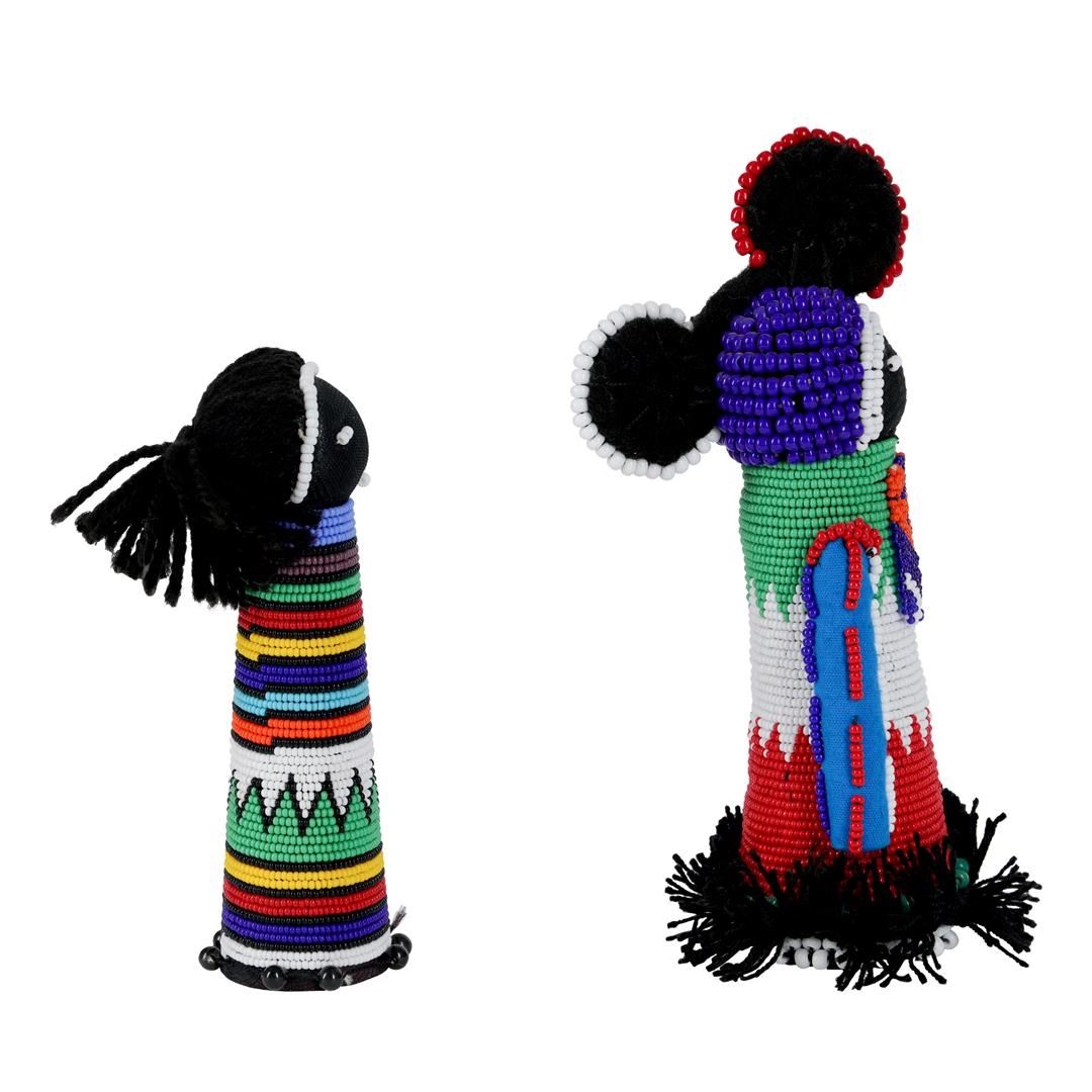 Amazingly intricate beaded Zulu dolls. The Ndebele Sangoma Doll is an important specialist, a diviner who claims contact with ancestral spirits. It is believed that she receives the will of the spirits. The Sangoma is referred to as the protector of society and her opinions and judgement are highly valued. Handmade in South Africa, all done in finely woven beads. Height of the figures are 6" tall and 7.5" tall. The dolls were made by a very talented Zulu beader, with hours put into these unique works of art.