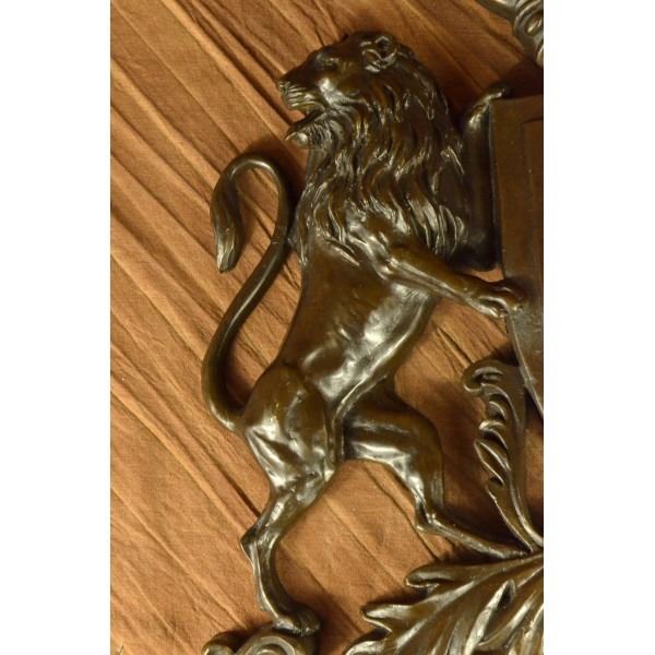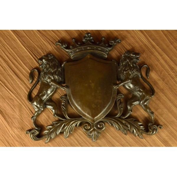 This amazing piece that would go lovely as a family traditional crest describes the power behind a shield and two lions. They were use as a way of protection from all weapons, enemies and evil, etc. This sculpture significance is strength and power. The royal crown is on top while two Barbary lions function as the holders of the shield. The handmade bronze sculpture was cast using the age old method of lost wax casting and stained with a brown patina finish for preservation. Bronze dimensions: Height 14 X Width 17 inches. Weight: 10 lbs. Please Note: This is a reproduction bronze sculpture from the original molded and signed. This featured bronze sculpture is a recast after the original, and has been done recently. This 100% bronze sculpture is an abstract piece certain to be a conversation piece.